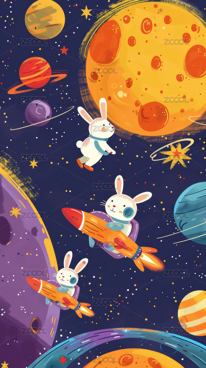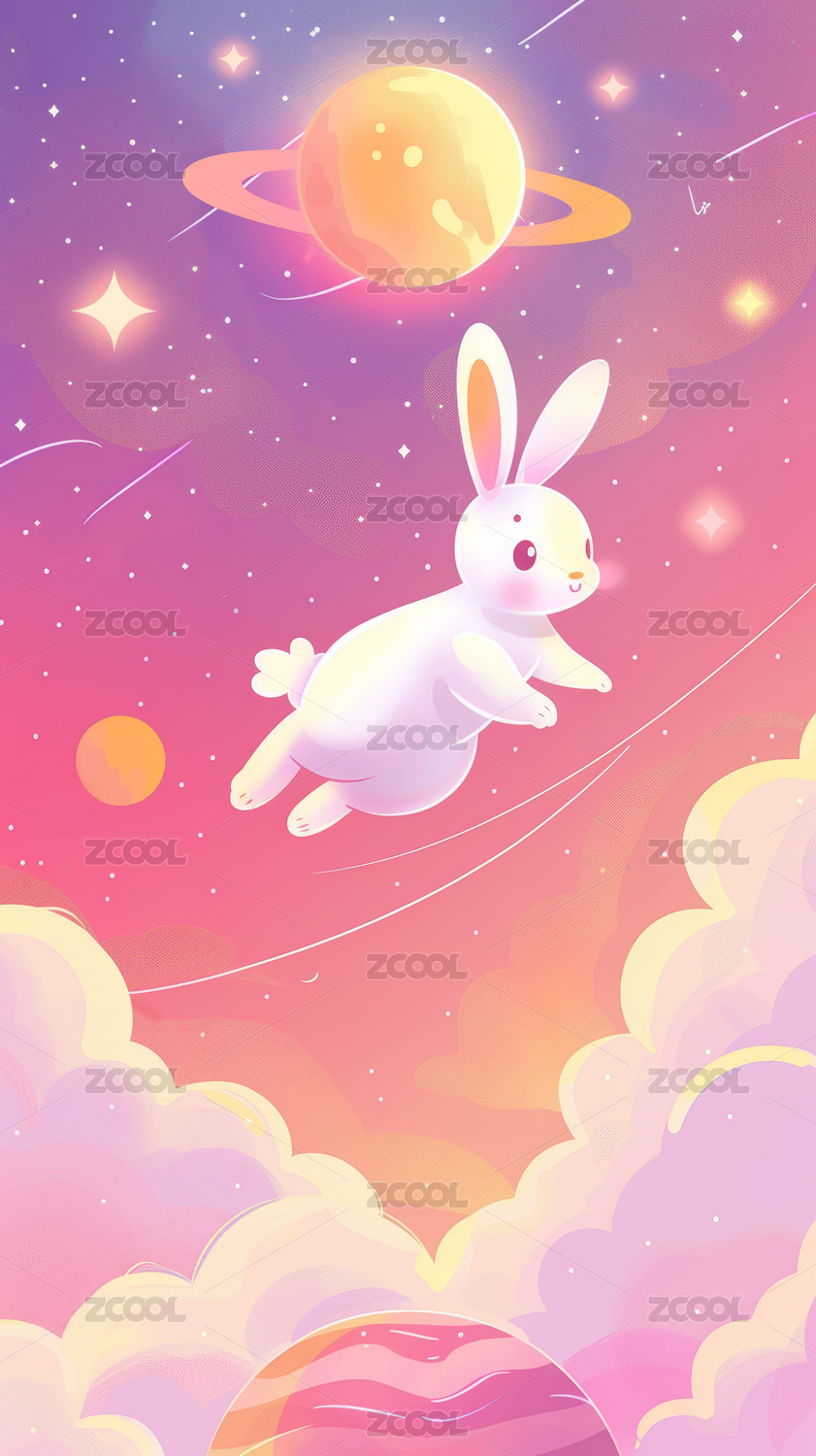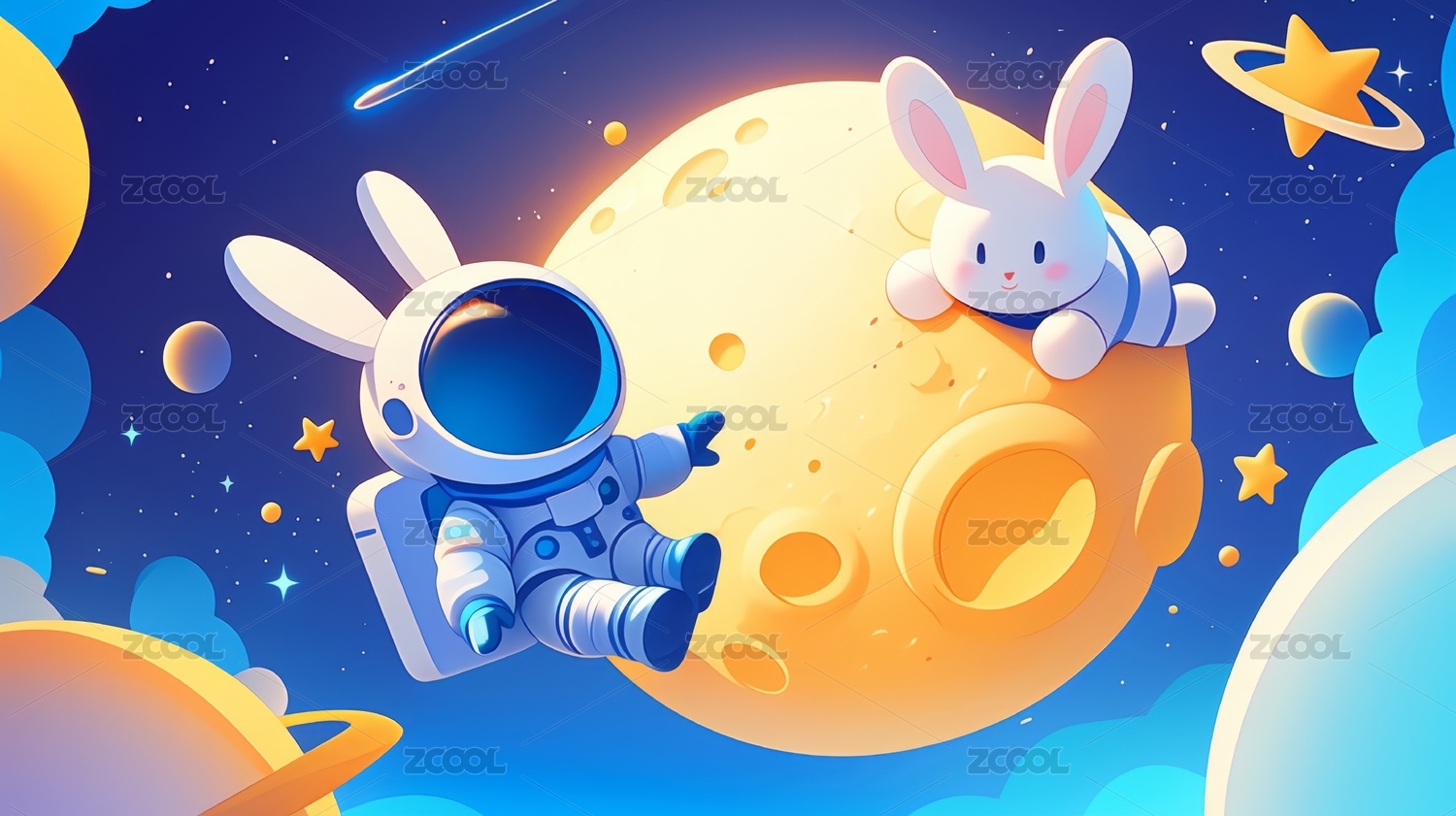 中秋节插画玉兔穿宇航服漂浮在太空手捧月饼