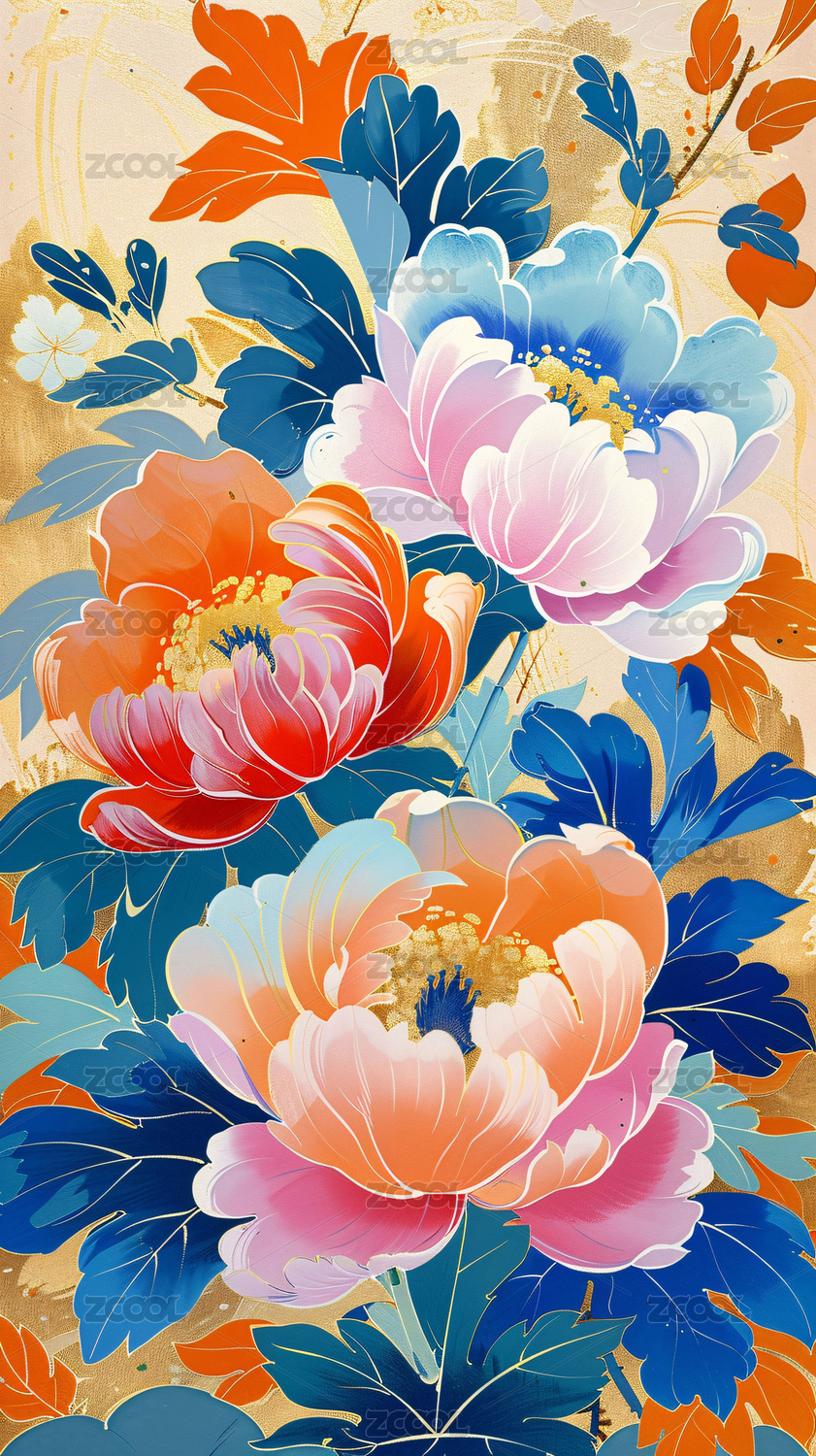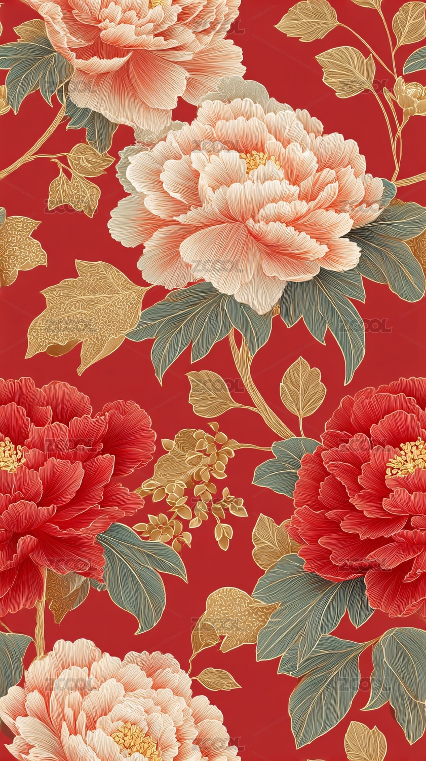 国潮牡丹花,中国风工笔画牡丹花卉插画