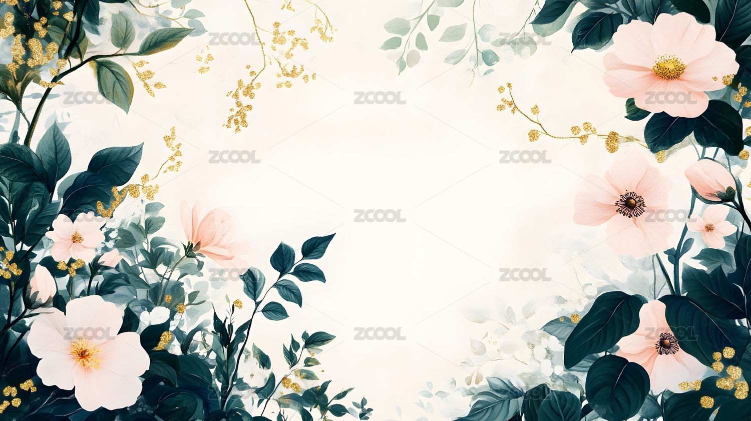 淡粉花朵与绿叶构成的唯美边框