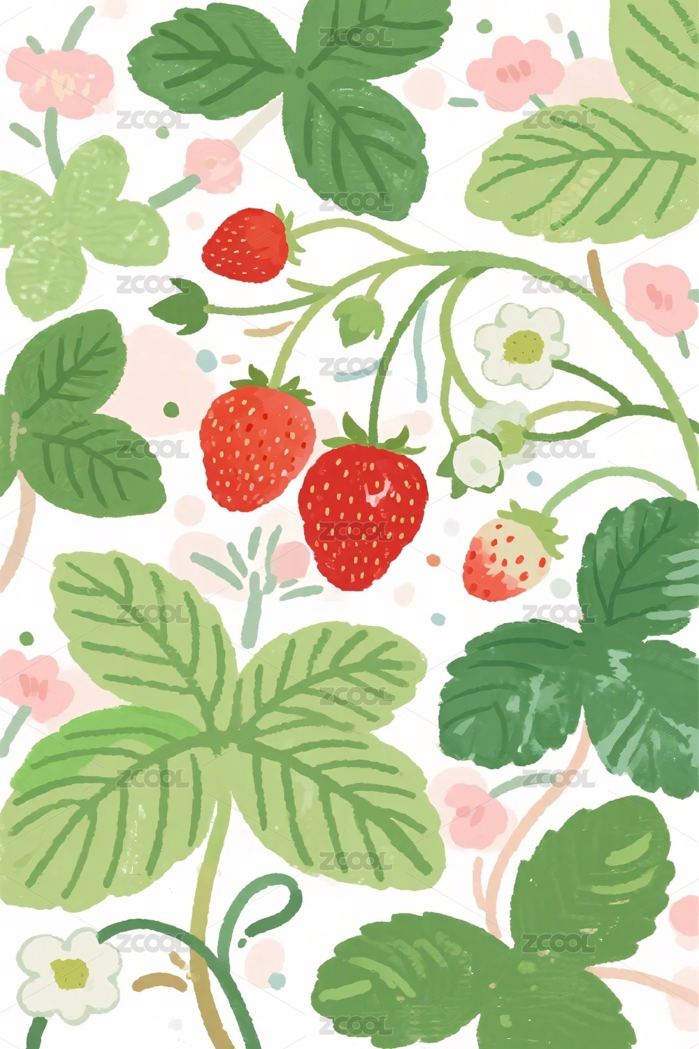 草莓,花朵,绿叶,插画,植物,花卉,水彩风,自然,清新,唯美
