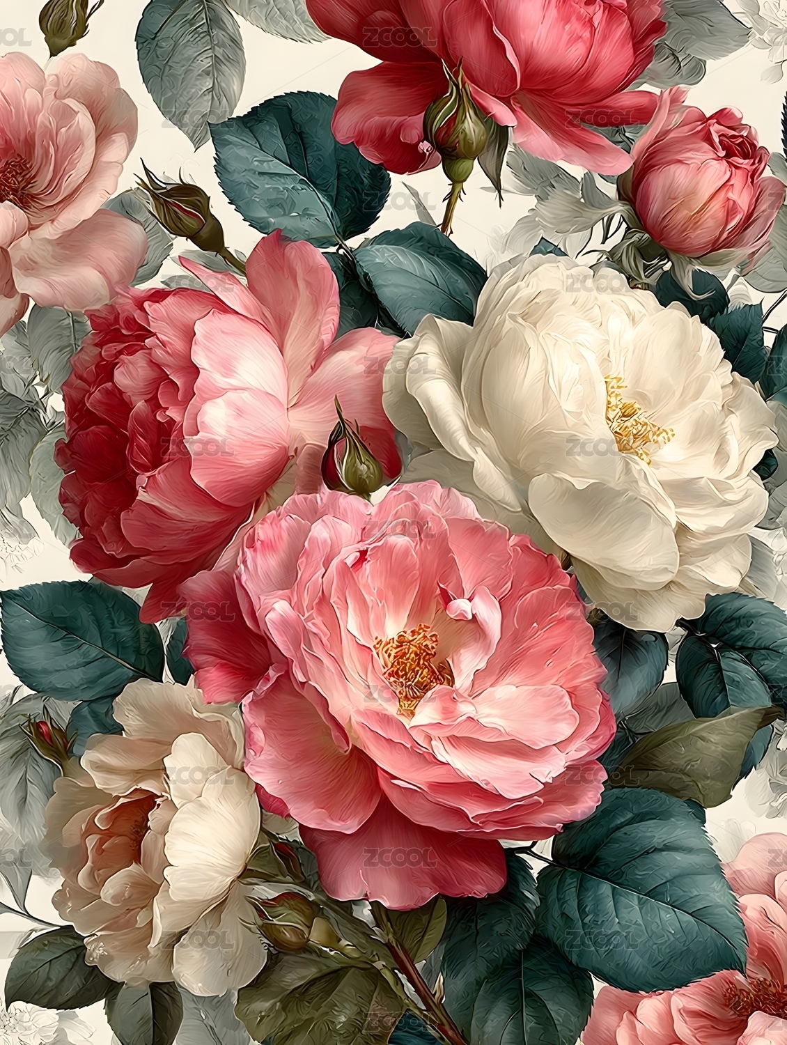 花卉,玫瑰,牡丹,叶子,插画,图案,植物,装饰,唯美,自然
