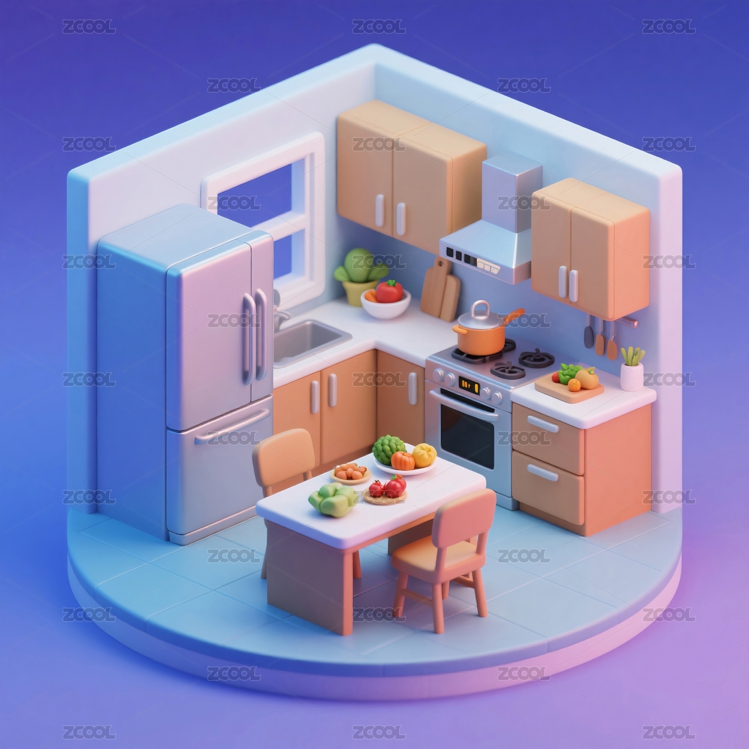 冷色厨房装饰装修俯视立体轴测图3D卡通插
