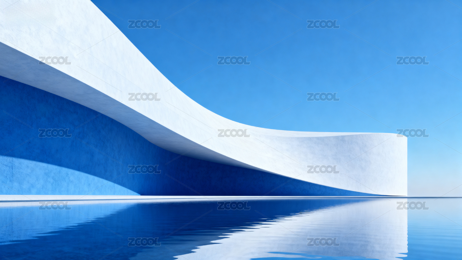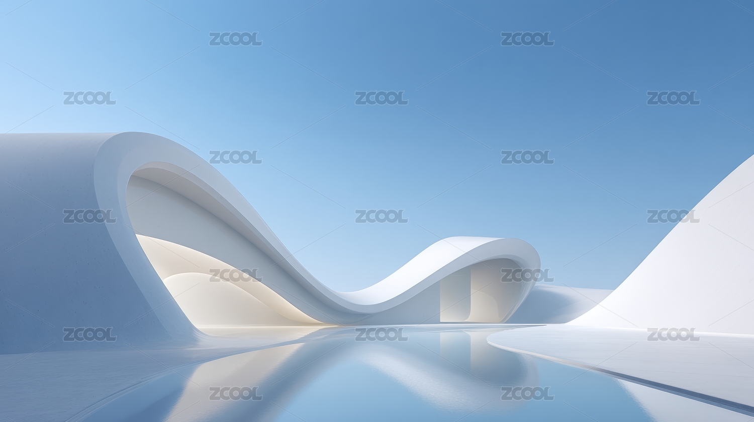 无人广场白色弯曲弧形建筑与倒影有天空背景