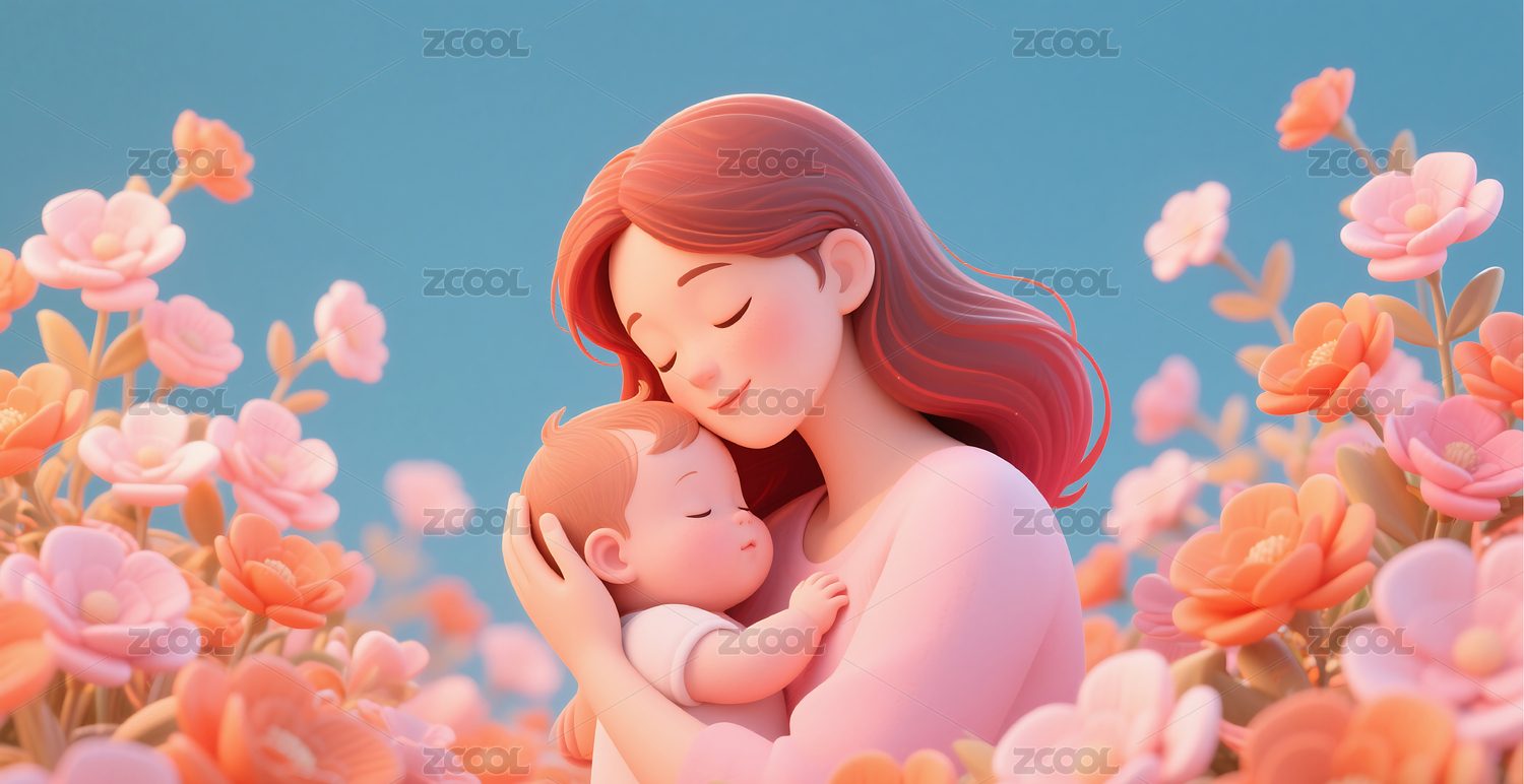 一个女人抱着孩子3D人物插画