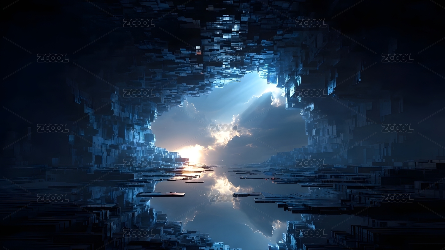 科幻梦境巨大空洞前看太空男人3D立体场景