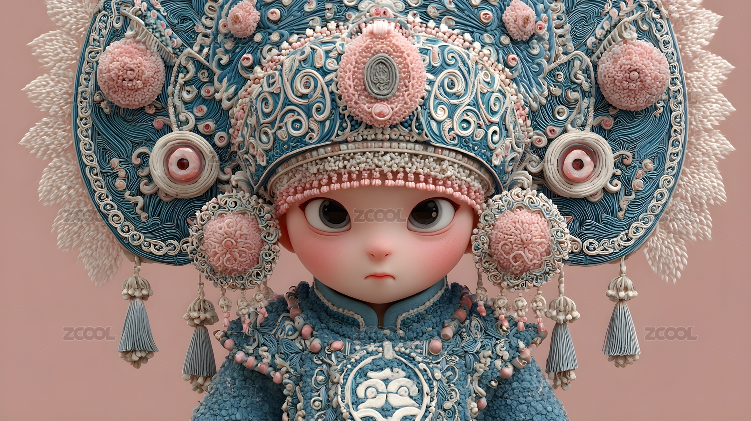 华丽蓝衣娃娃,装饰头冠,柔和背景