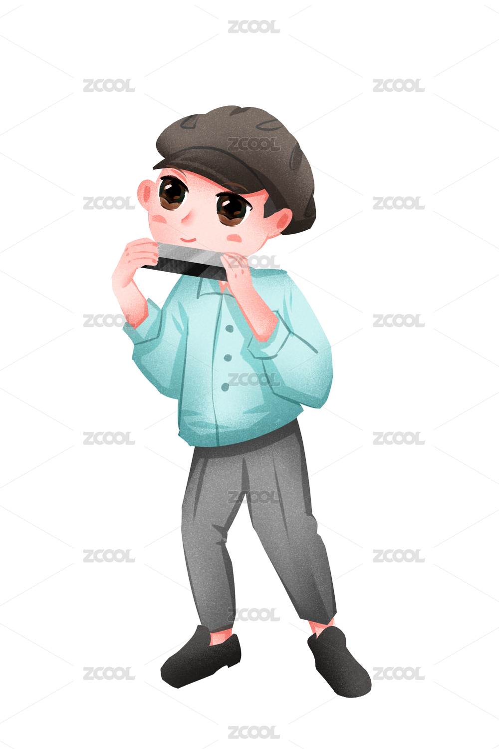男孩站着吹口琴 可爱风格国际音乐日插画