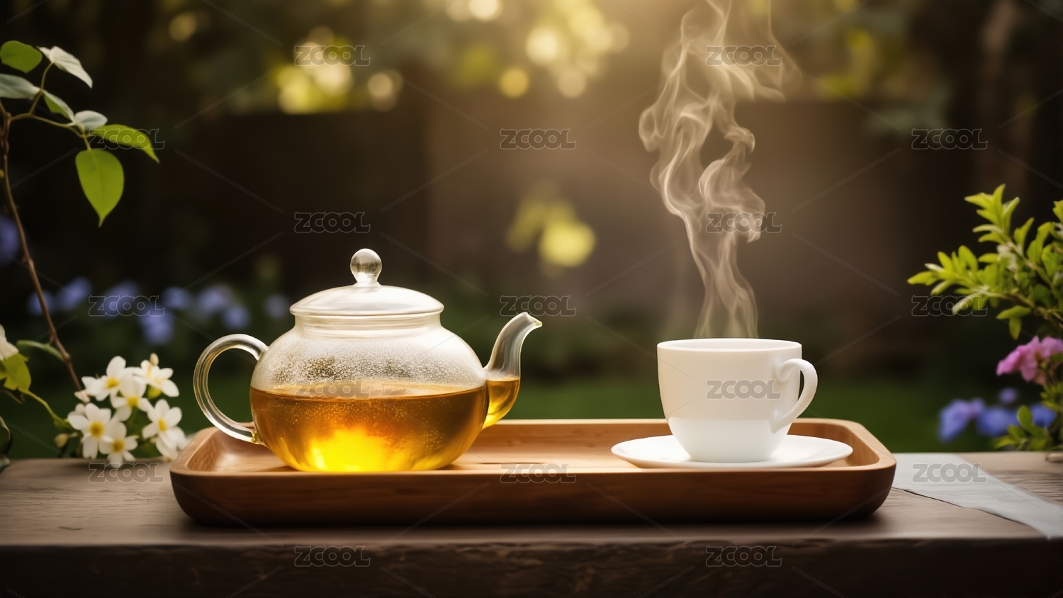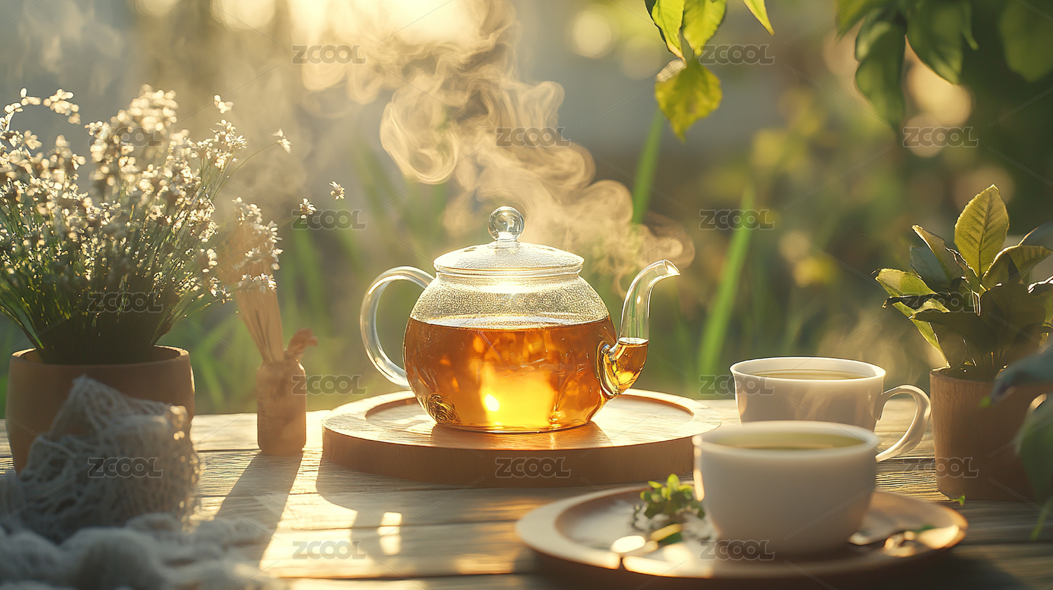 茶壶,茶杯,茶叶,阳光,植物,温暖,宁静,舒适,家居,氛围