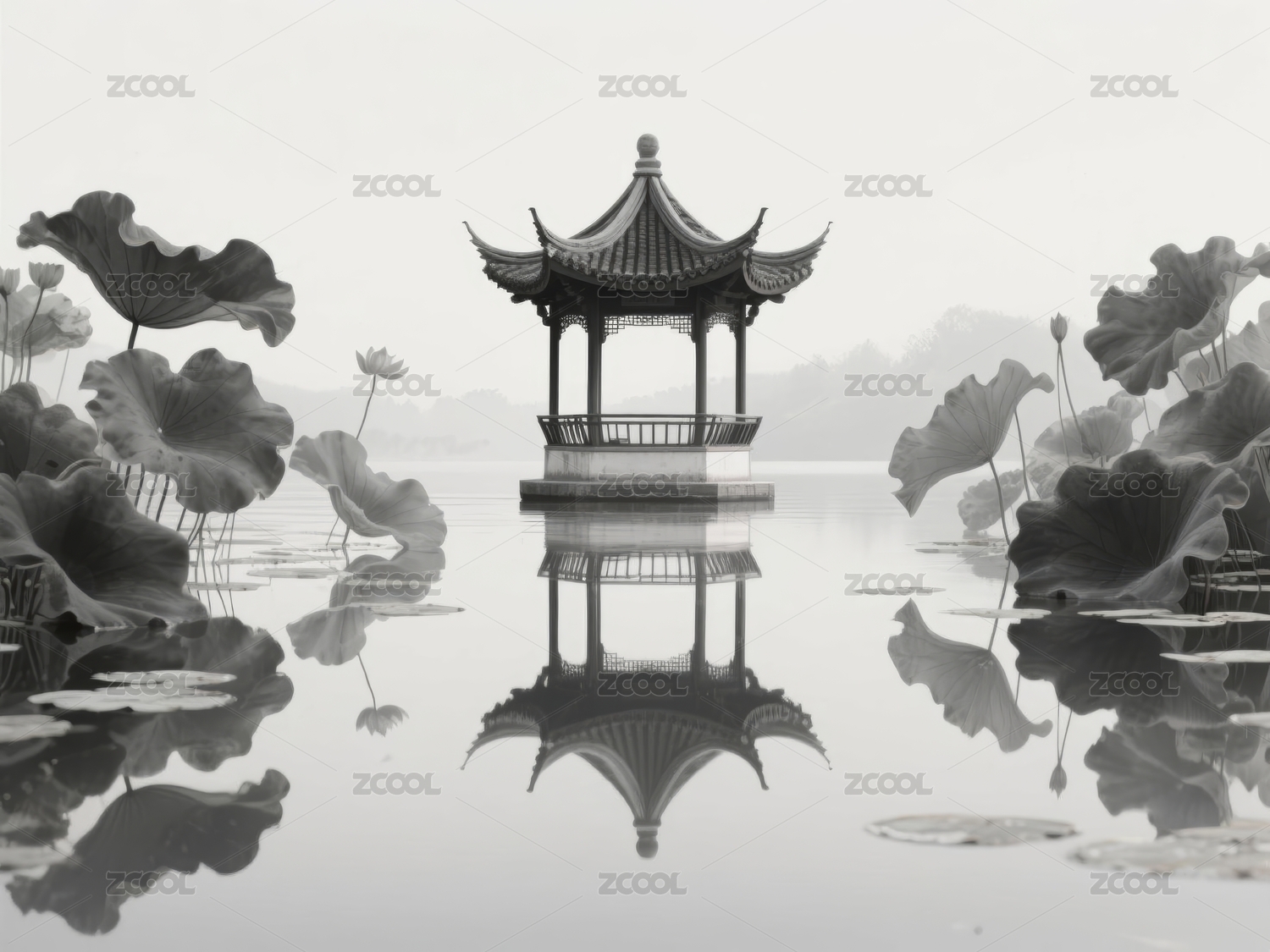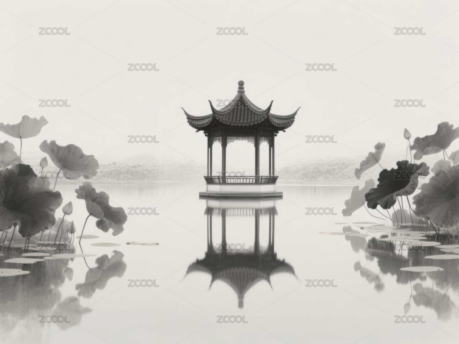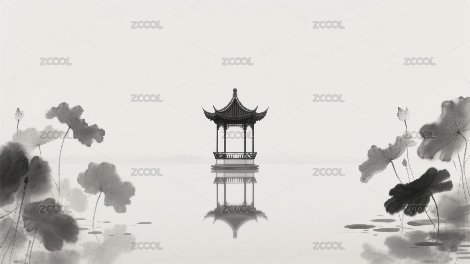 主视觉,水墨,园林,景观,场景,古亭,湖面,倒影,荷花,荷叶