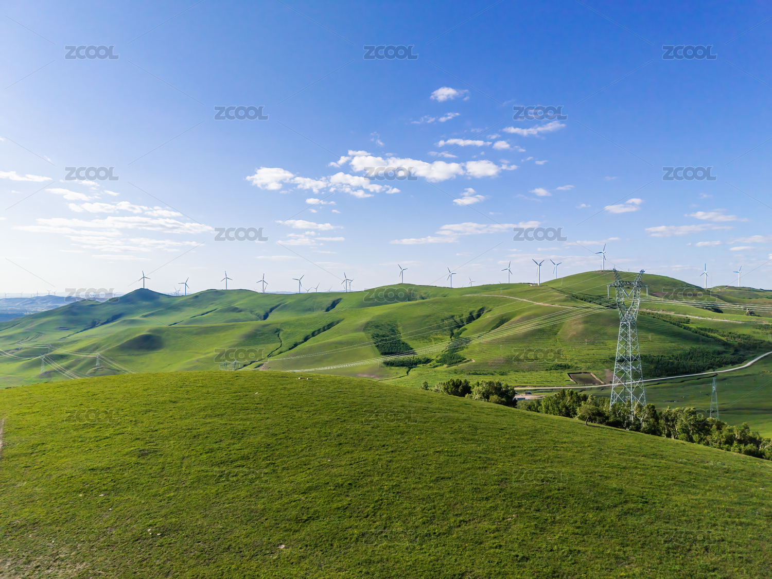 坝上的蓝天白云、草原和风车