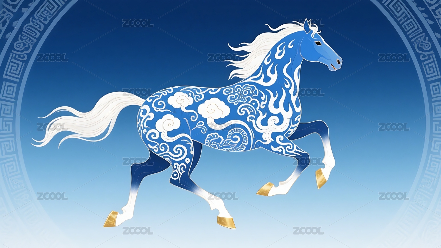 马,蓝色,花纹,奔跑,鬃毛,尾巴,云纹,图案,装饰,设计