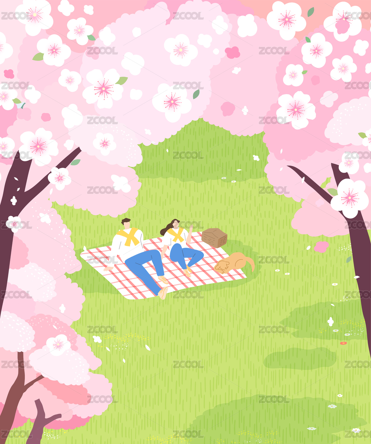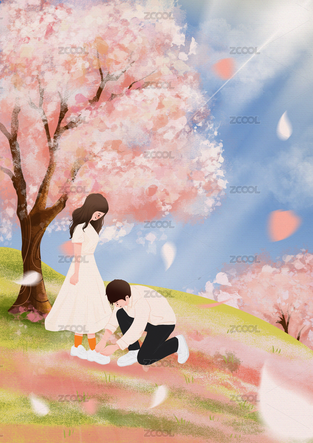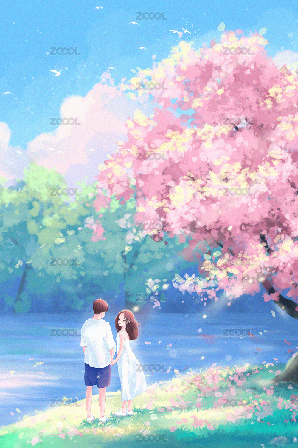 春日樱花树下浪漫七夕情人节情侣治愈插画