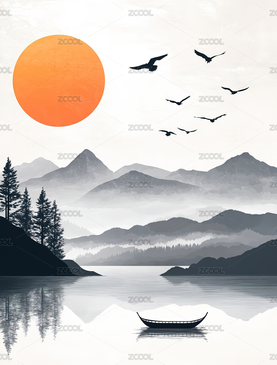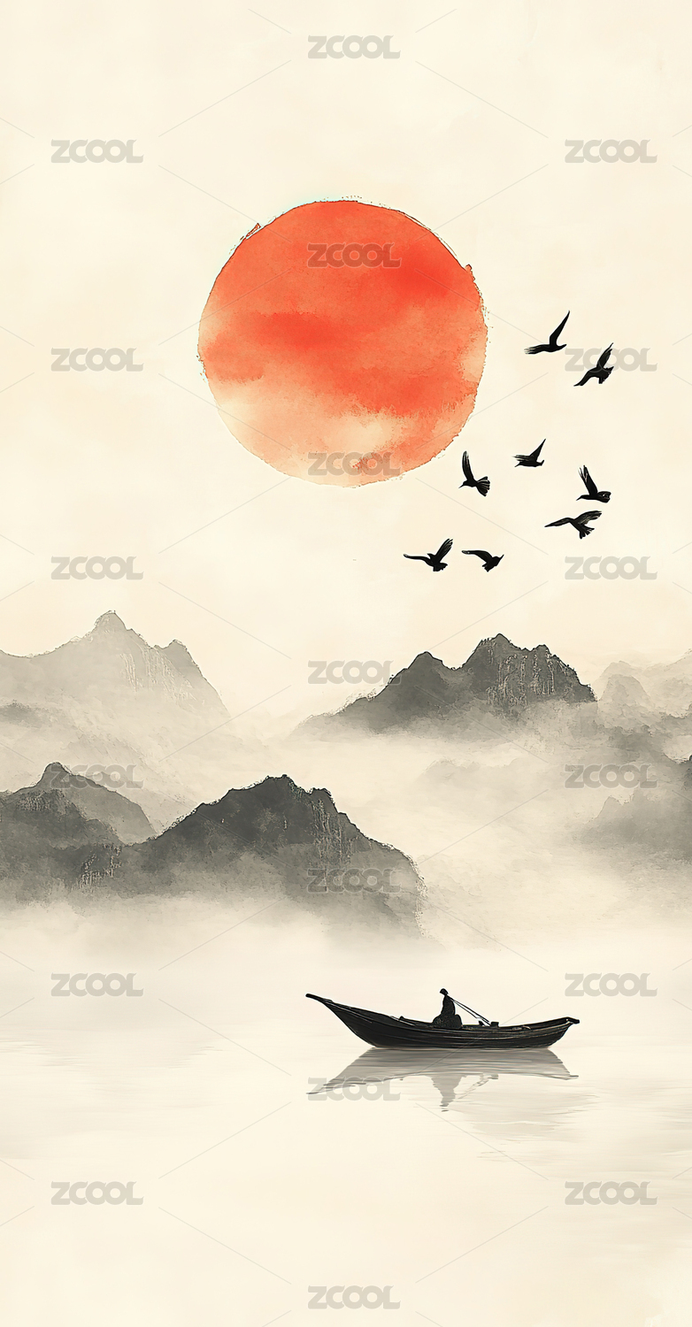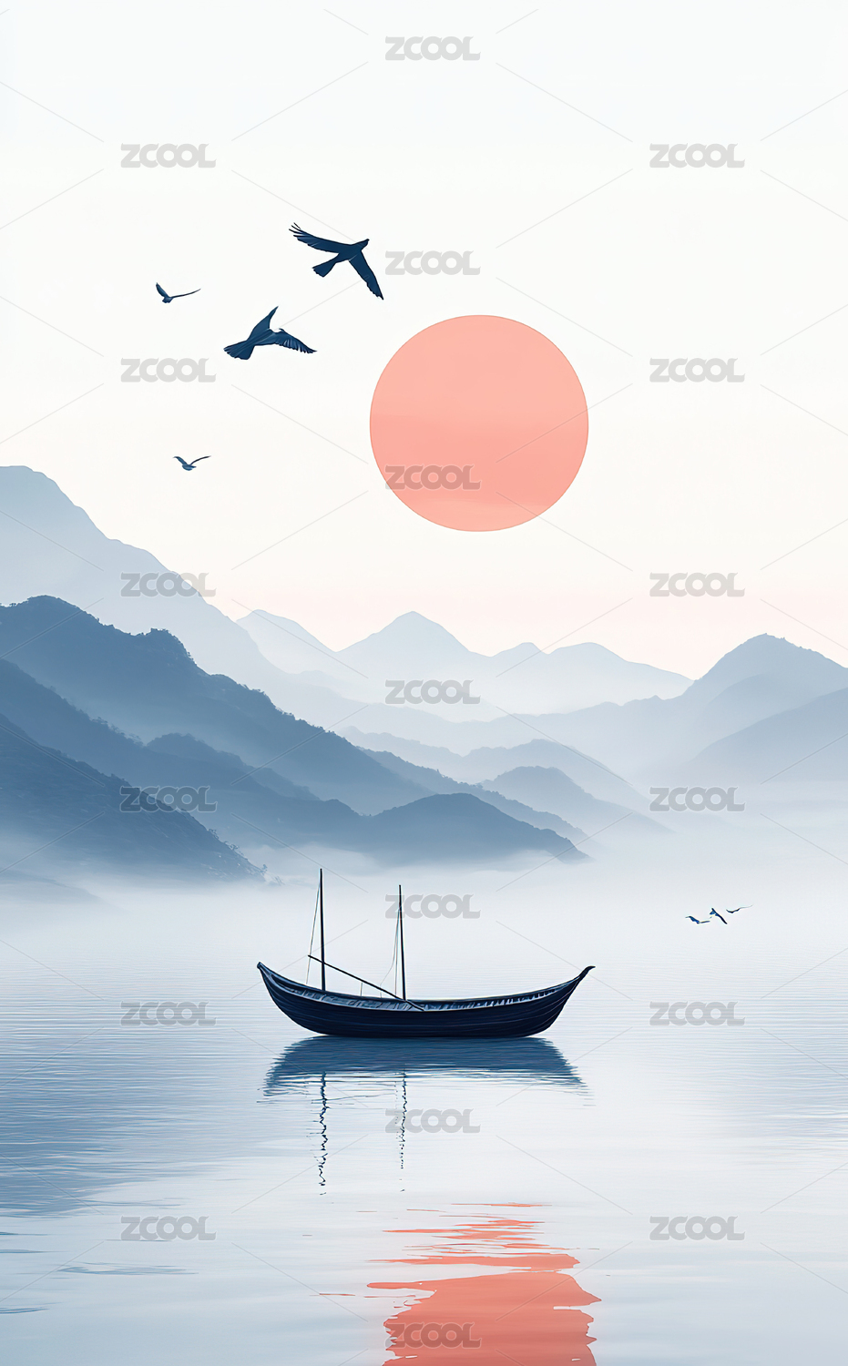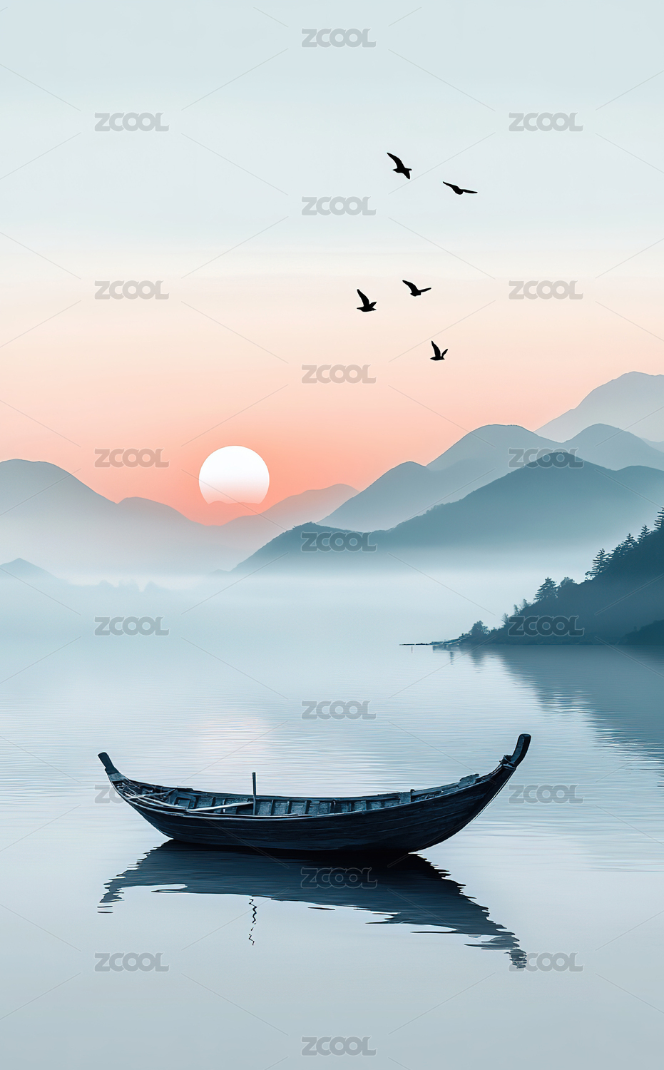 山脉, 宁静,日落, 湖泊, 渔舟, 渔夫, 鸟群, 倒影, 水面, 飞鸟