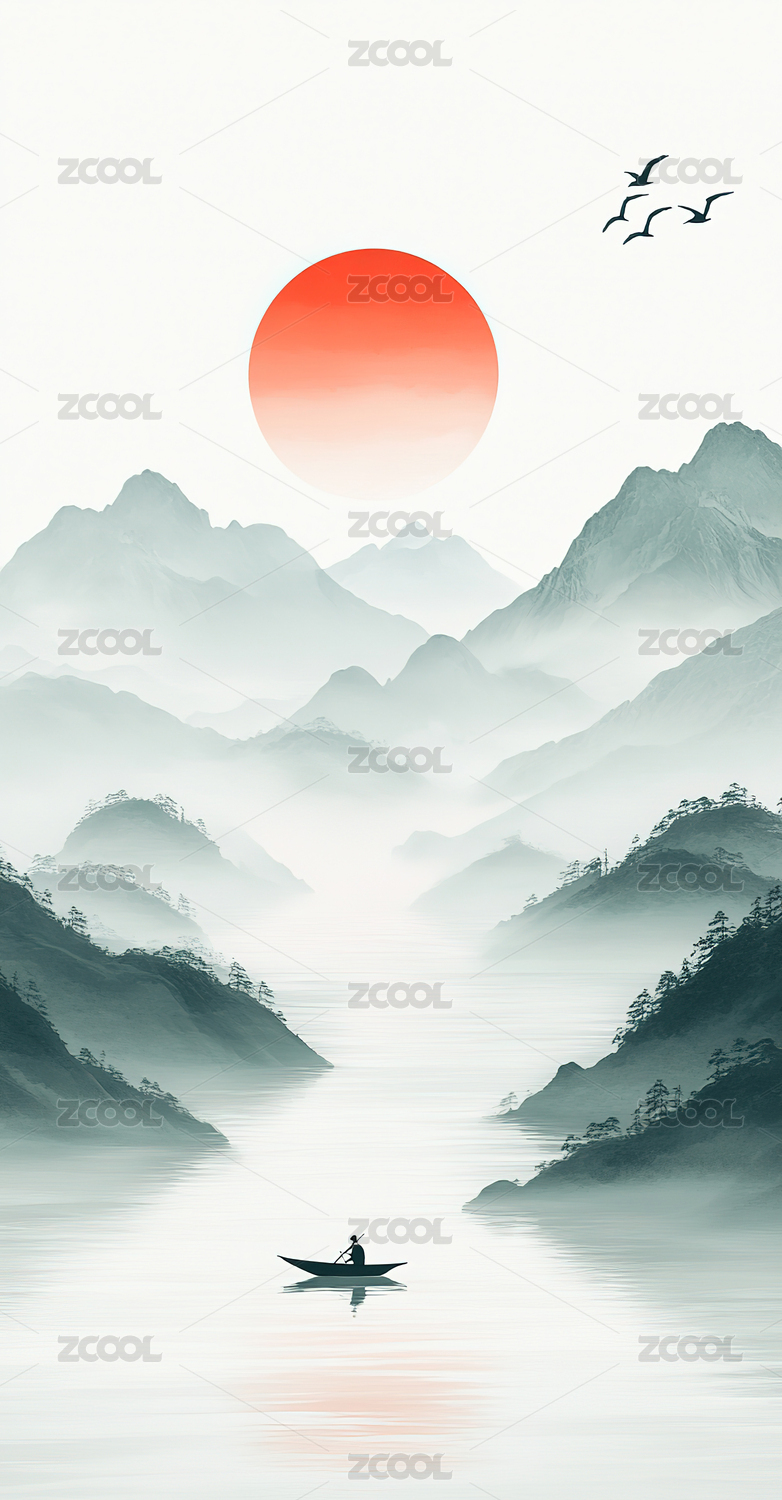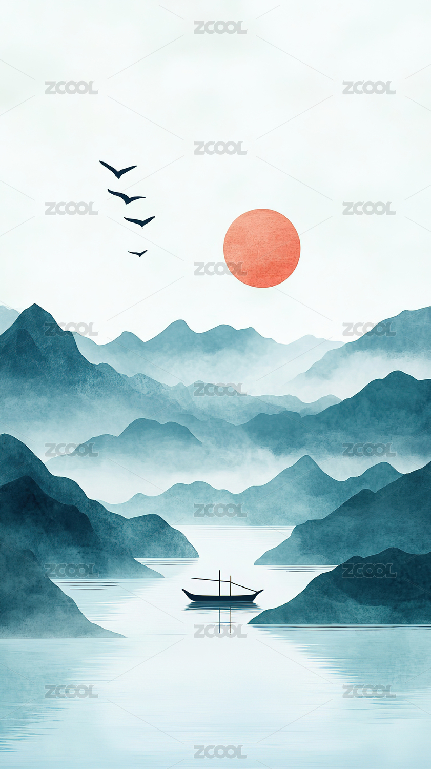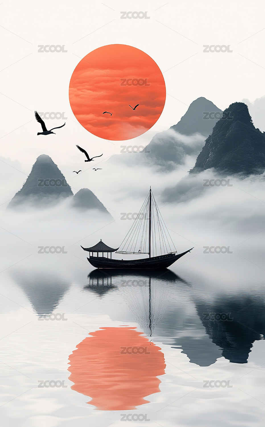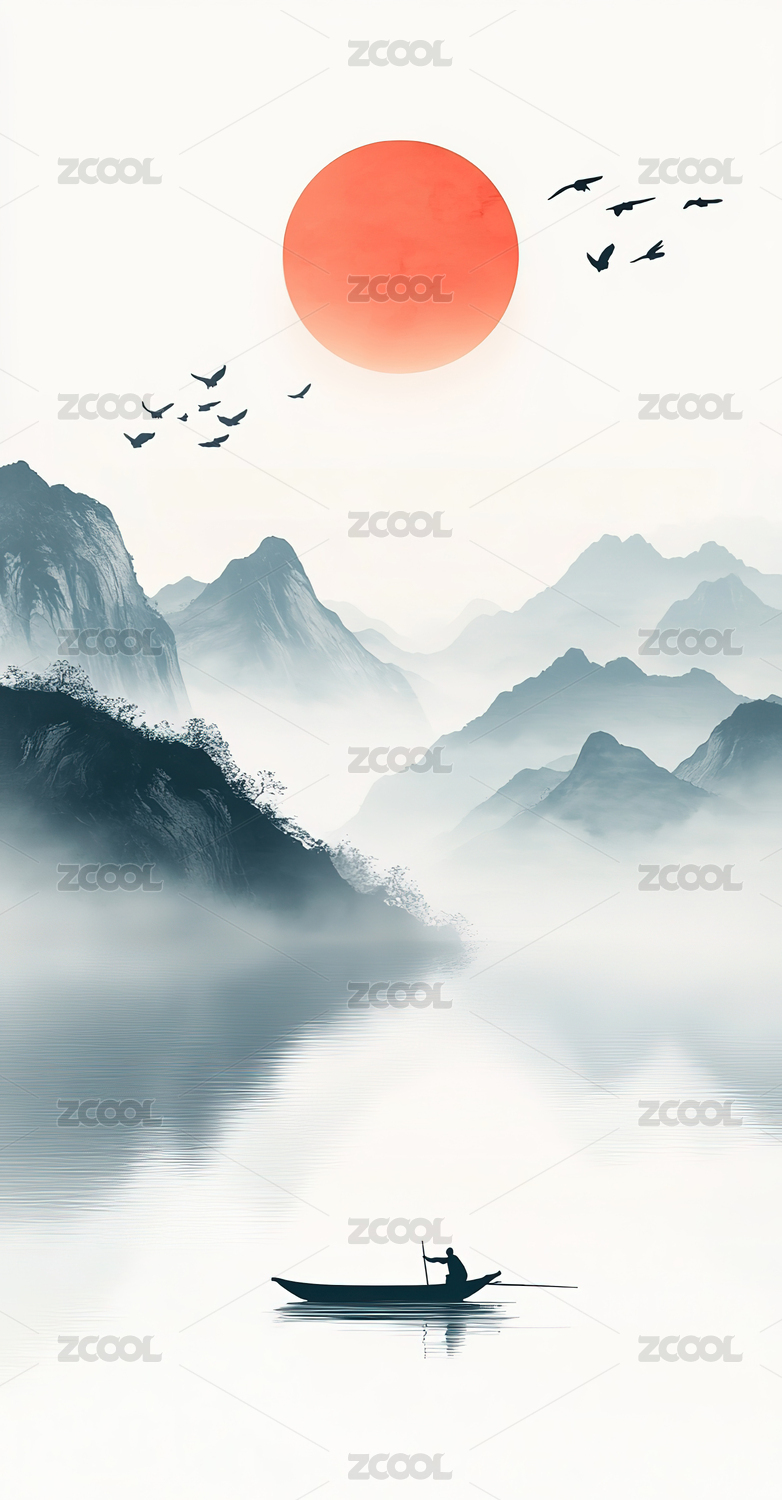 山脉, 宁静,日落, 湖泊, 渔舟, 渔夫, 鸟群, 倒影, 水面, 飞鸟