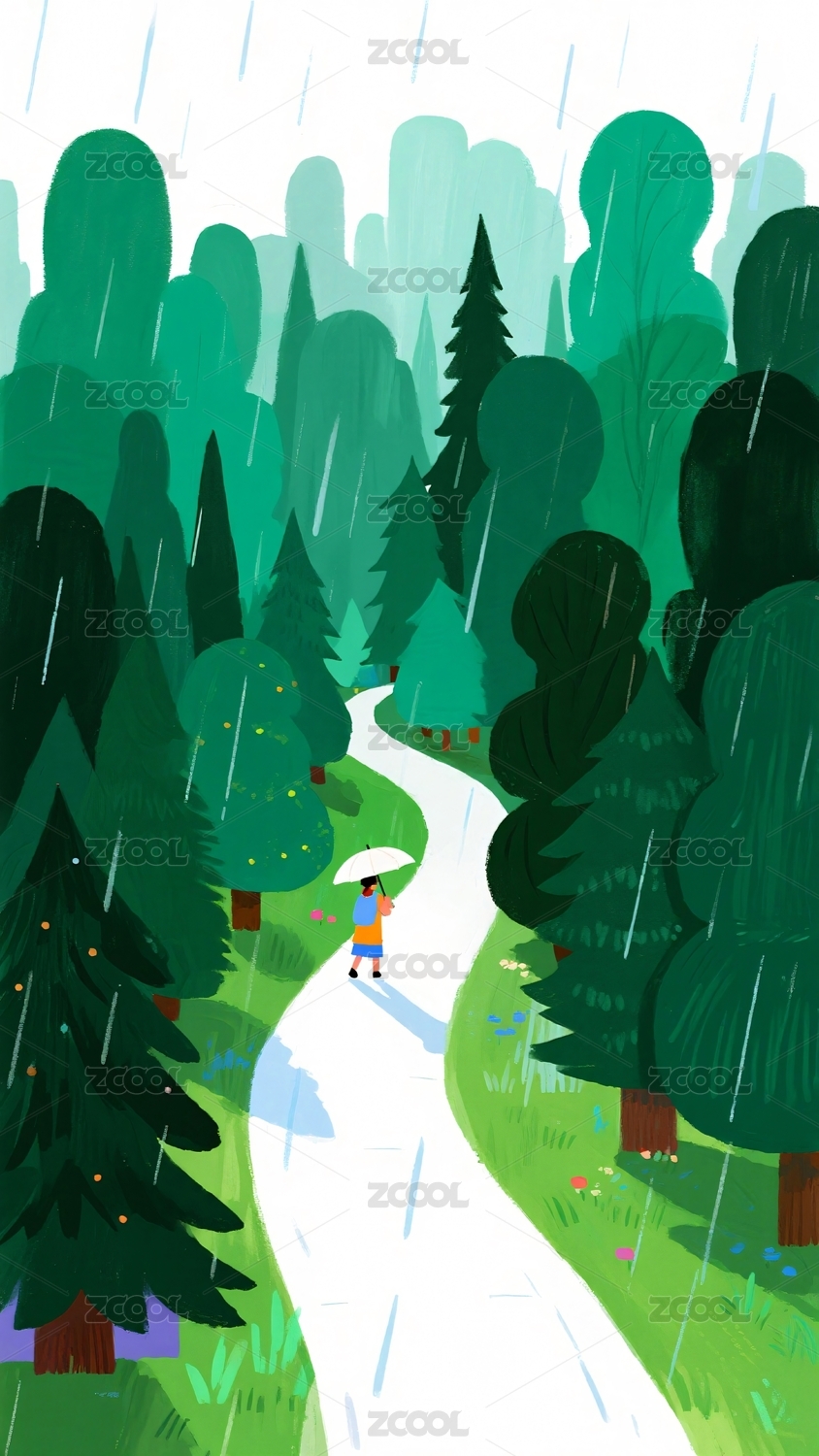 女孩打着伞走在雨天的桥上 扁平风格插画