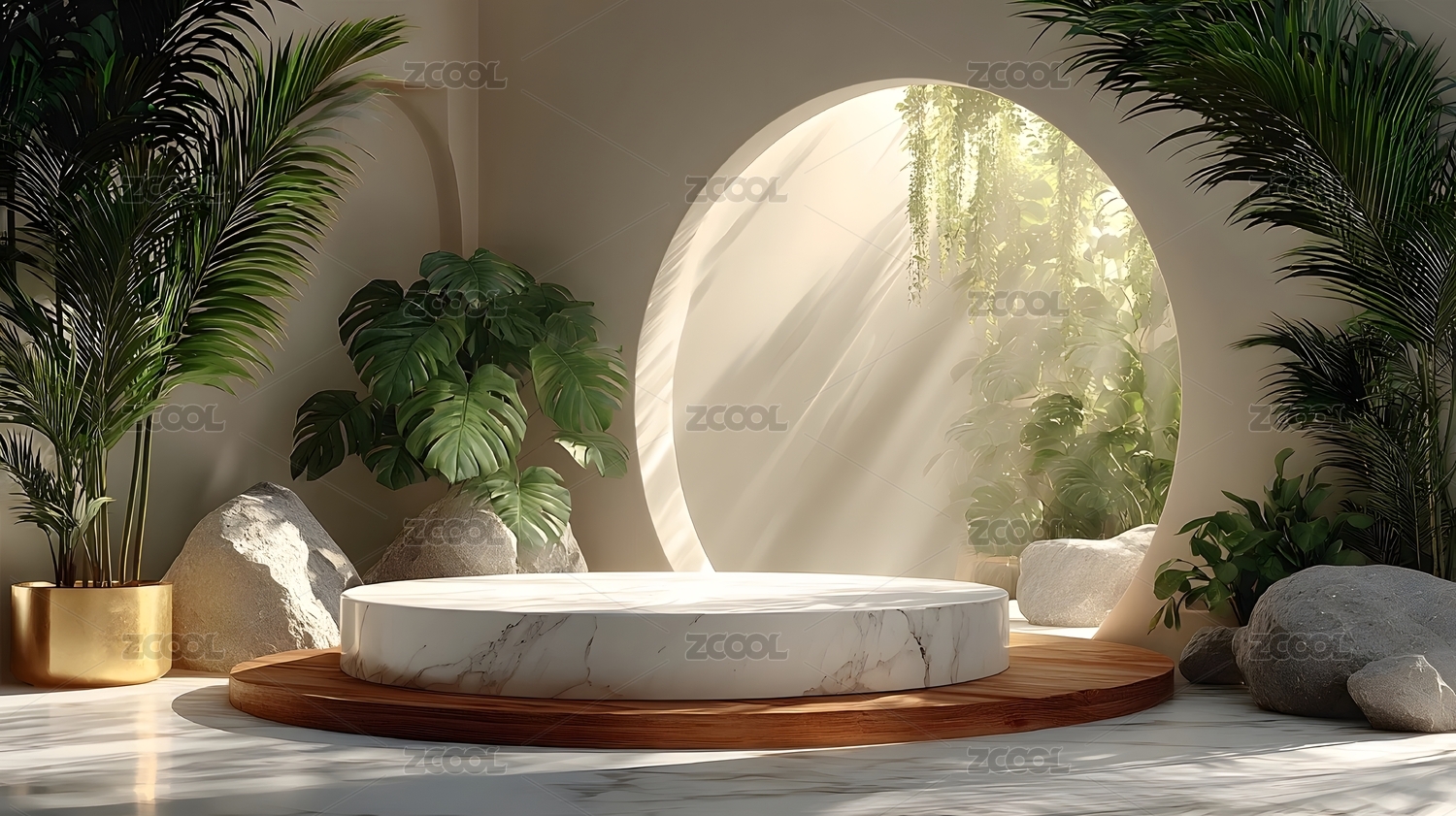 3D热带泳池中的白色拱门商品展台