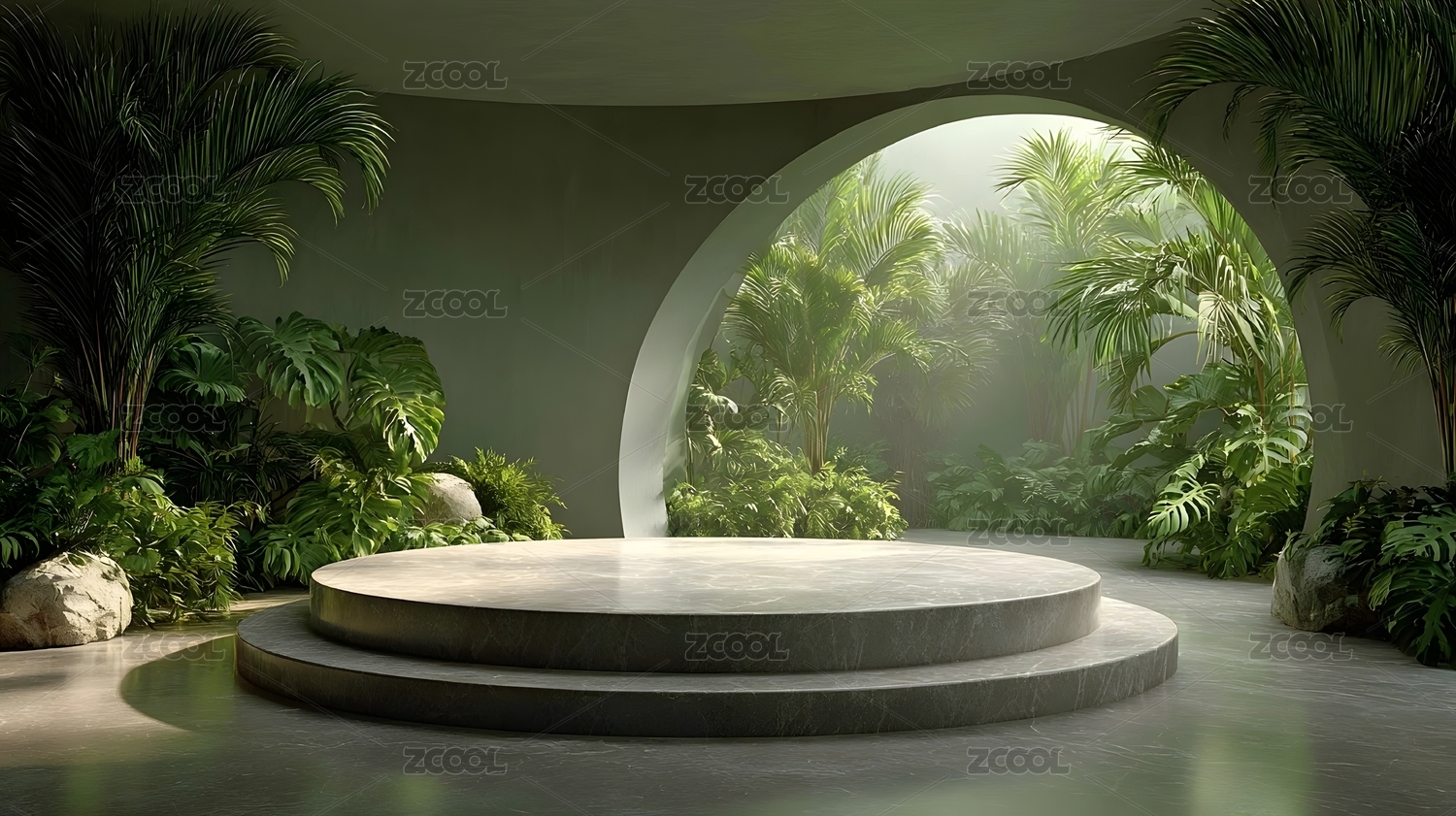 清新绿植中水面上的圆形展台