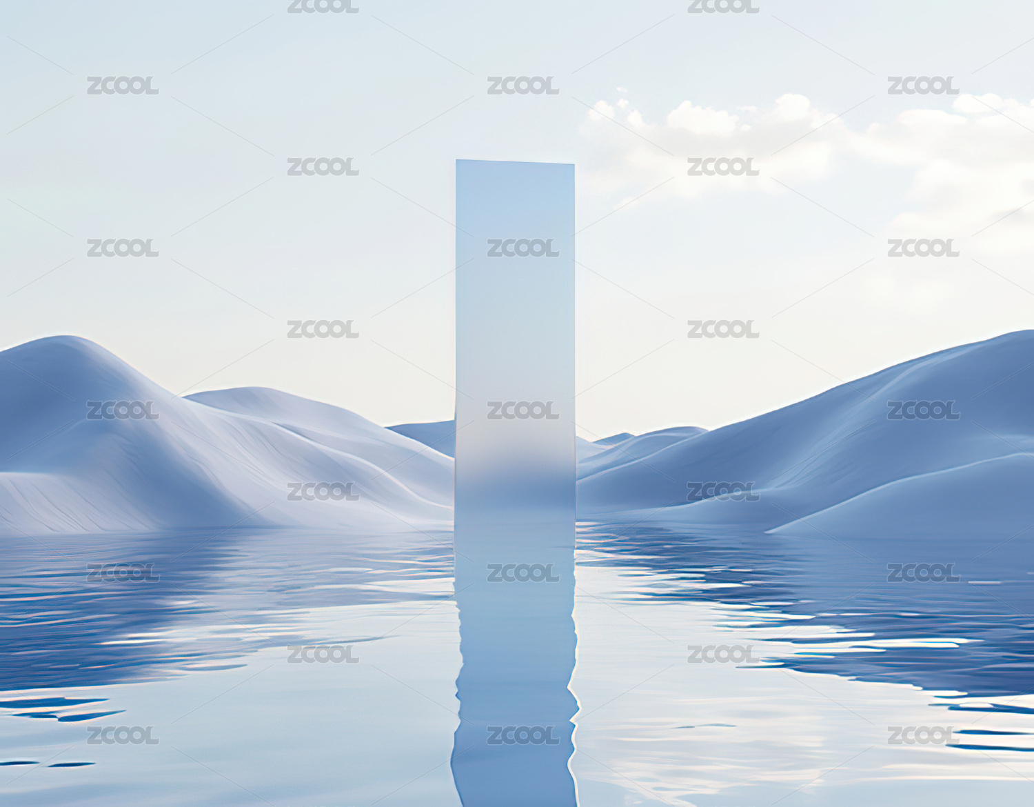 沙漠中的透明门映照天空与水面
