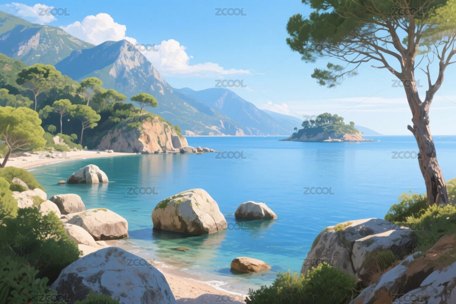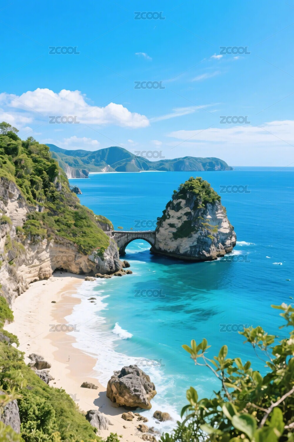 大海,海岸,岩石,山峦,植被,蓝天,海洋,悬崖,海湾,阳光