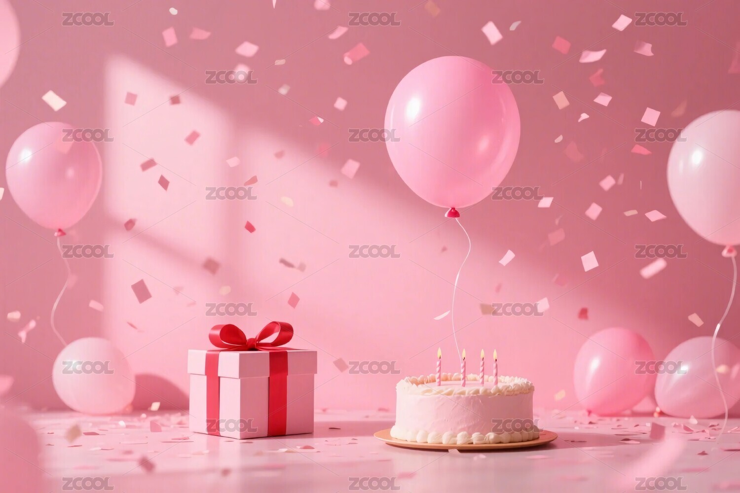 生日蛋糕点燃蜡烛粉色气球装饰背景