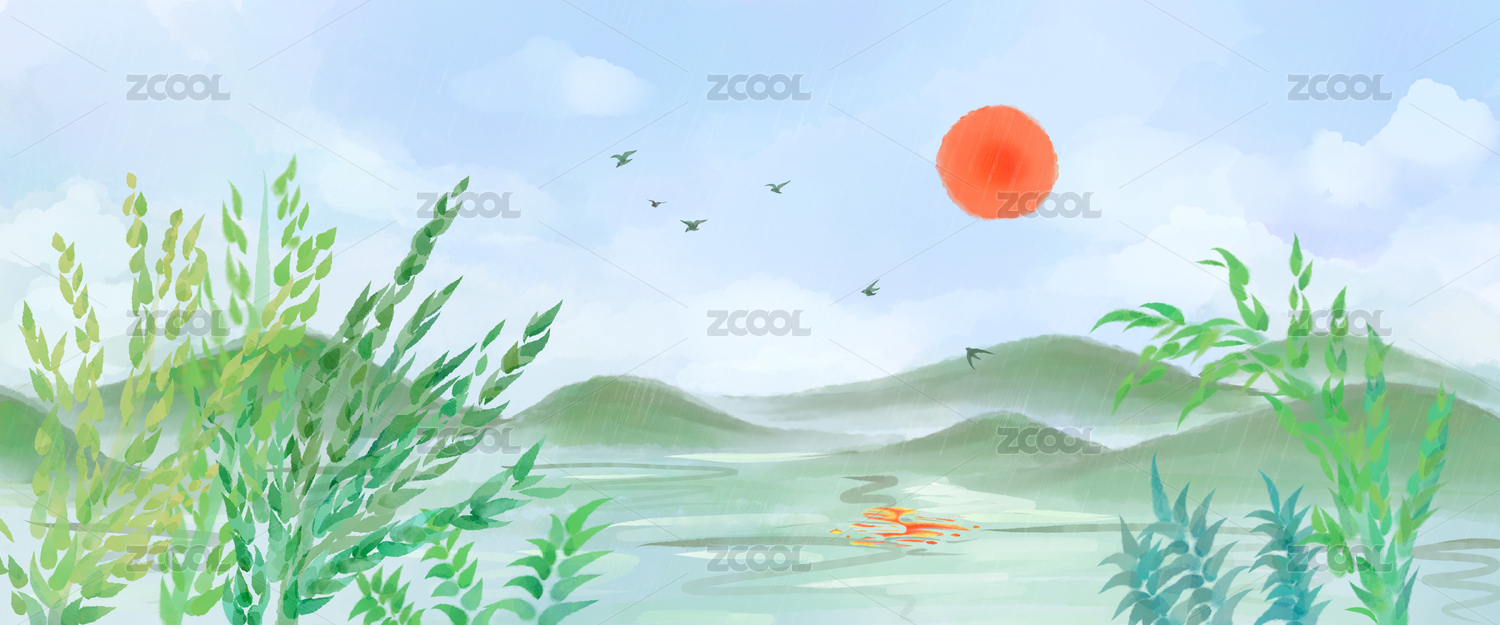 二十四节气白露田野风光白鹭在天空飞翔,水彩秋季插画