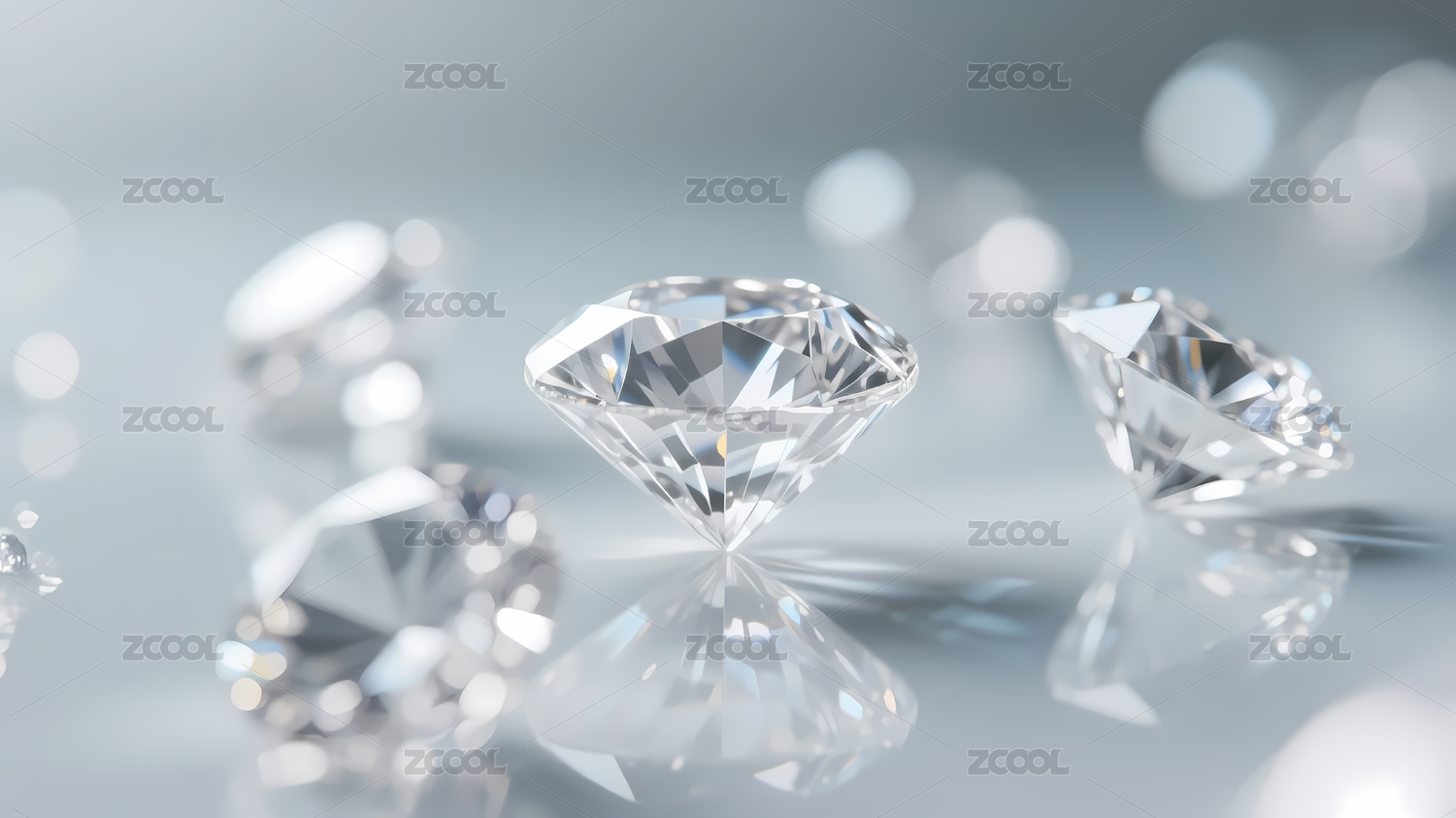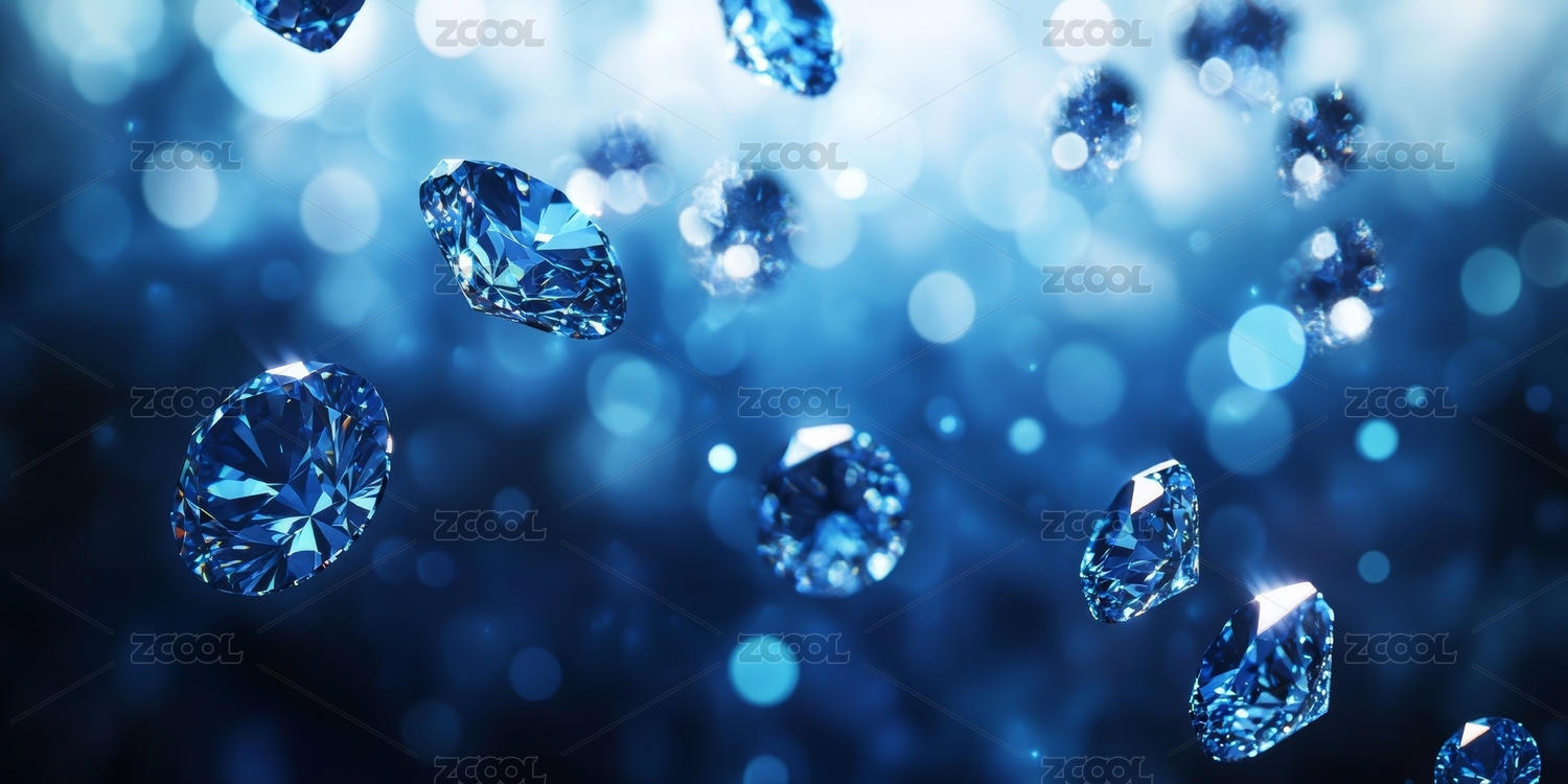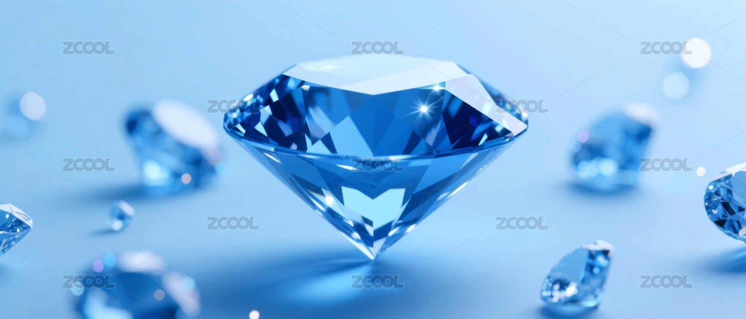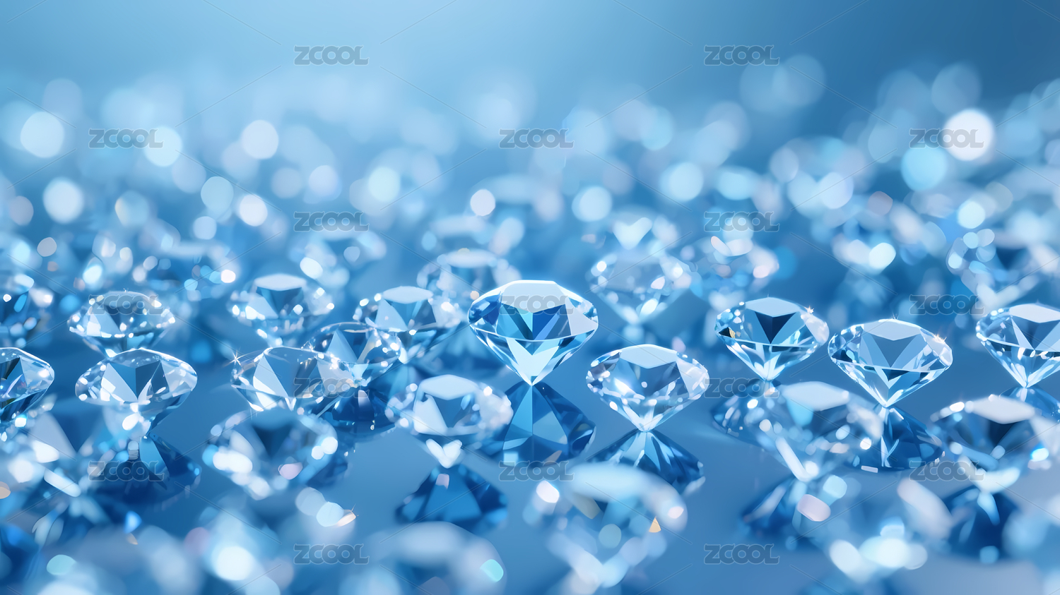蓝色晶莹剔透的钻石在蓝色背景下闪耀