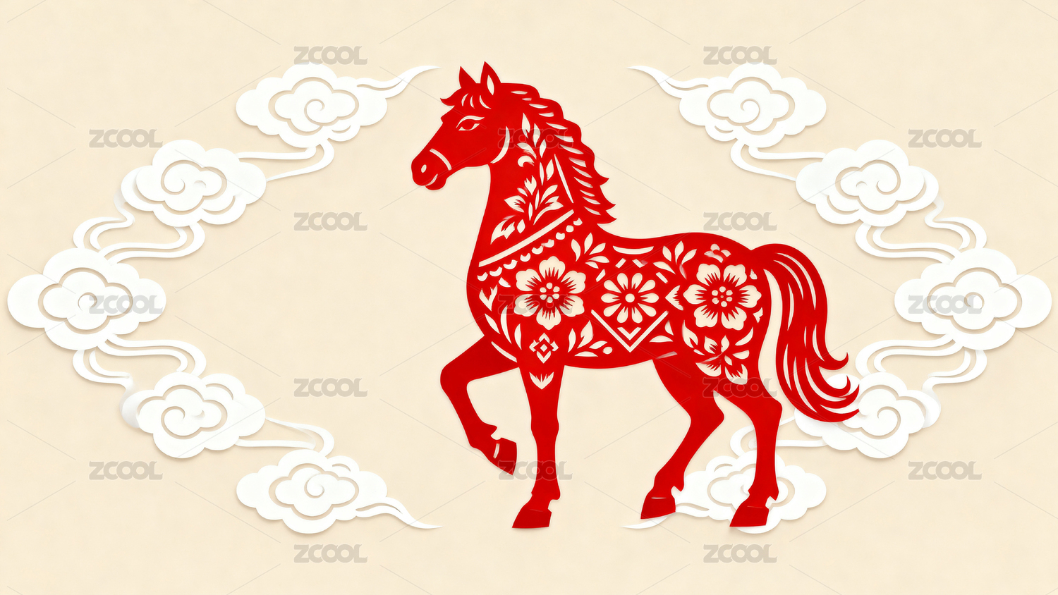 红色剪纸马配祥云图案装饰