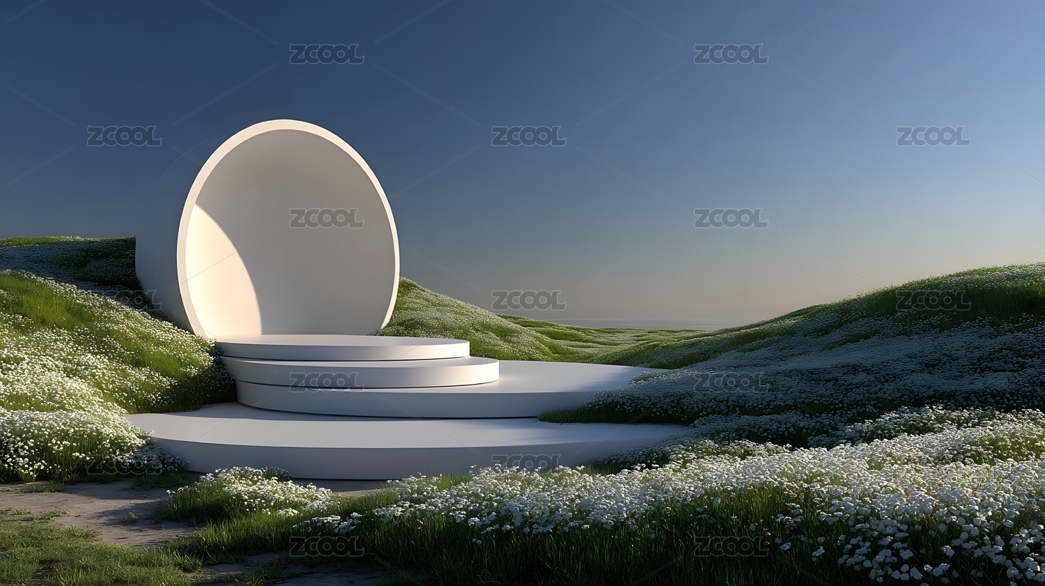 梦幻蒲公英花园中的白色环形雕塑