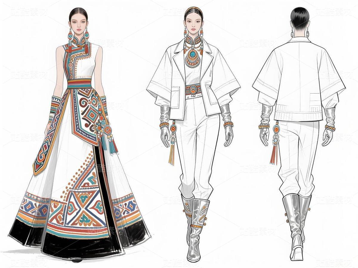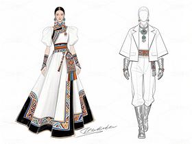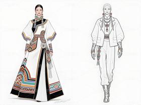 这件银白色旗袍以鄂伦春民族精神为魂,将冰雪森林的意境融入现代剪裁。旗袍领口饰以鹿角纹银饰,衣身缀满传统云卷纹刺绣,宝蓝色与金色丝线交织出强烈色彩对比。外搭毛绒滚边斗篷,呼应狩猎文化中的兽皮服饰。裤装侧缝垂落流苏链饰,手套嵌有骨珠与镂空银片,每一步皆铿锵有韵。整体设计既保留民族图腾的野性张力,又通过极简线条展现高定优雅,让鄂伦春文化在时尚舞台上凛冽重生。
