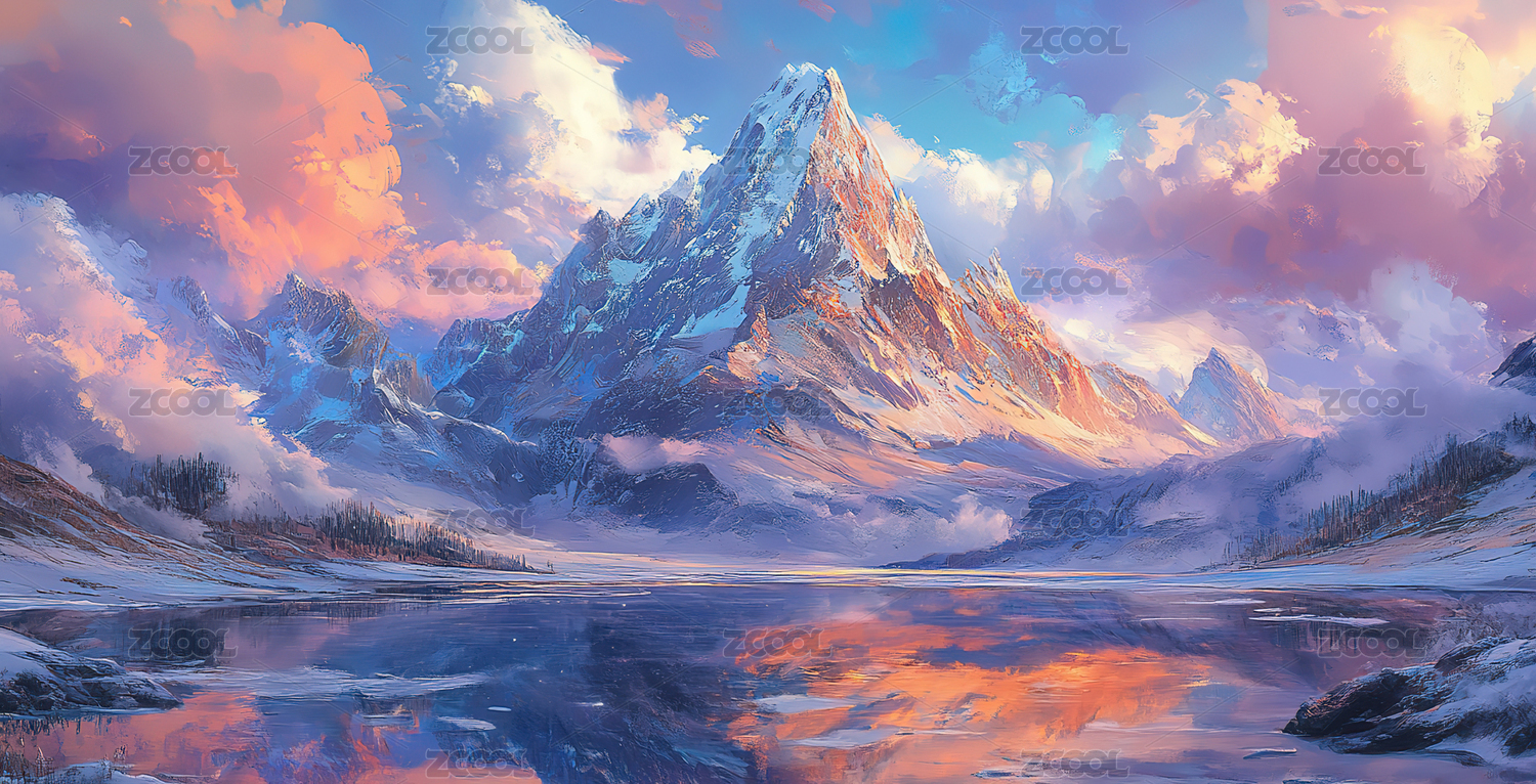 粉金色雪山风景插画背景