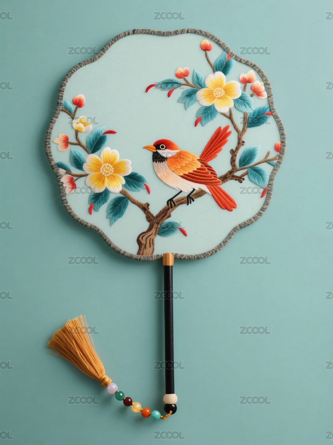 团扇绣鸟花卉图案