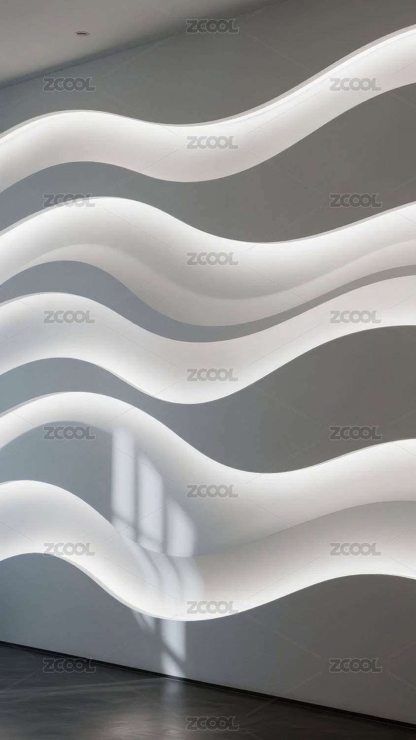 室内设计,现代风格,空间布局,家居布置,绿色装饰,波浪墙面,简约家具,植物点缀,光线柔和,艺术装饰