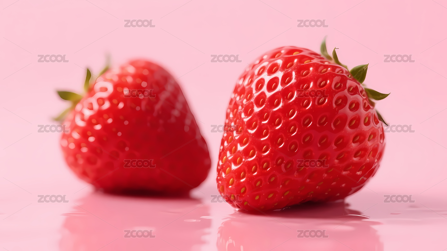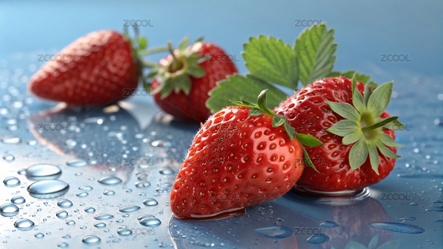 背景,清新,明亮,浅蓝,草莓,鲜红,水珠,绿蒂,反射,生动