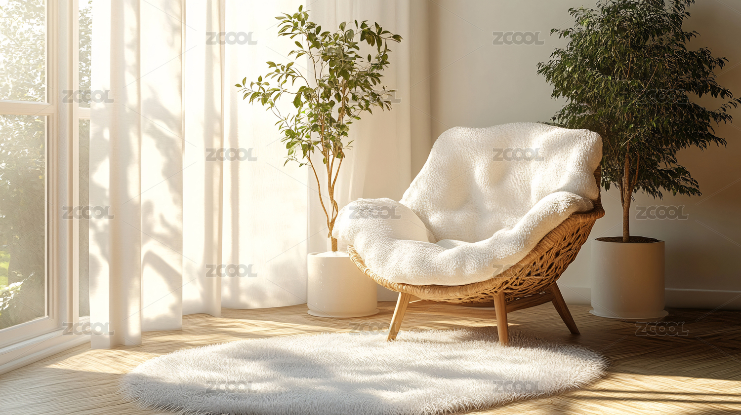 阳光透过窗户绿植藤椅