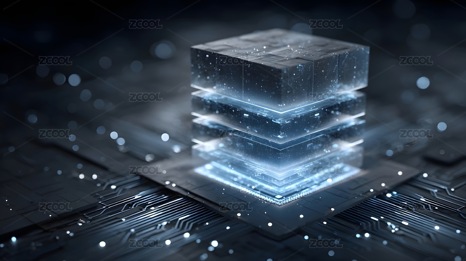 科技感电路板上蓝色发光智能立方体
