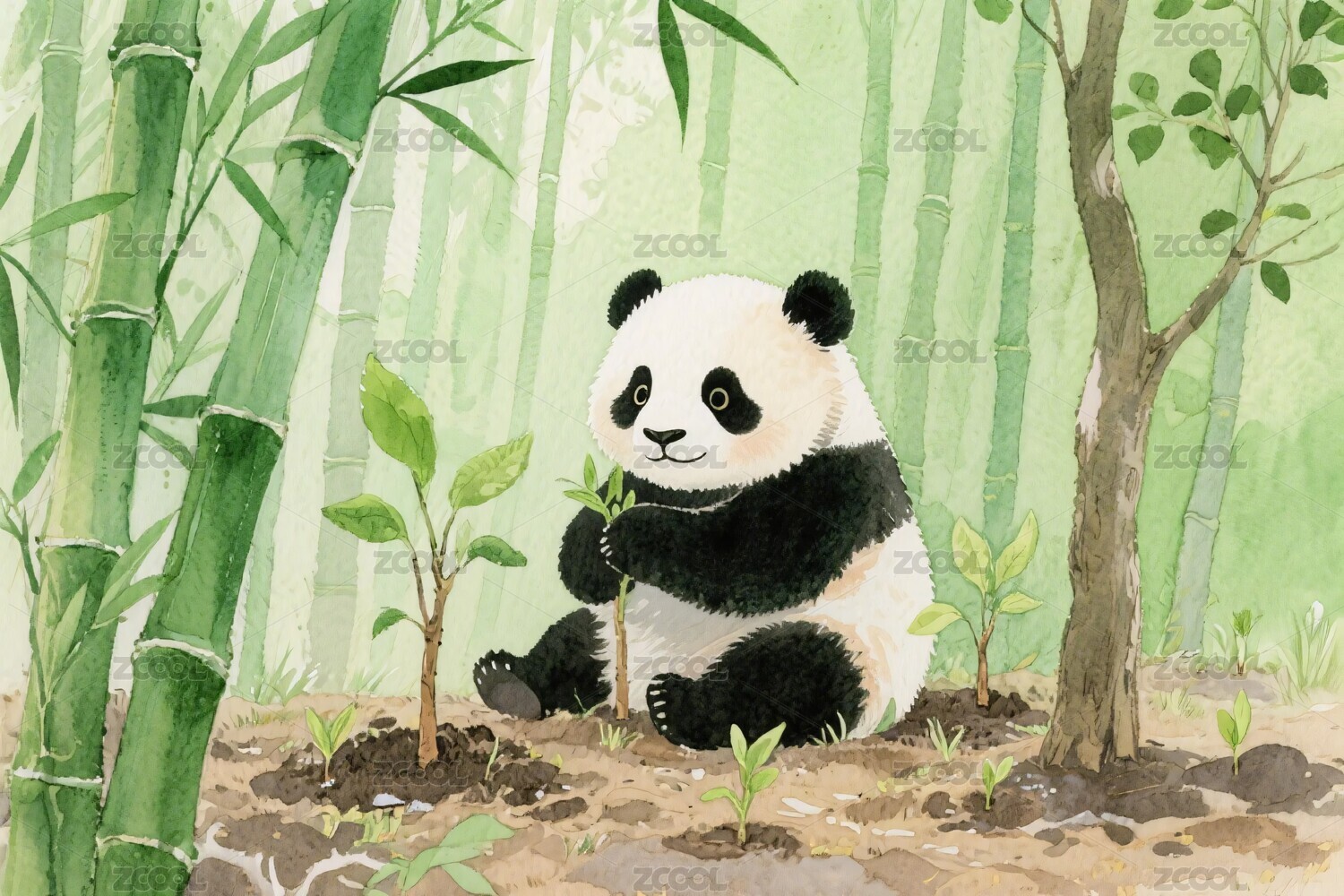 水墨熊猫雅致感竹林场景