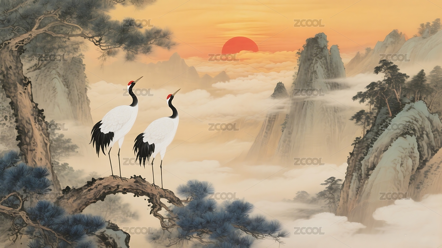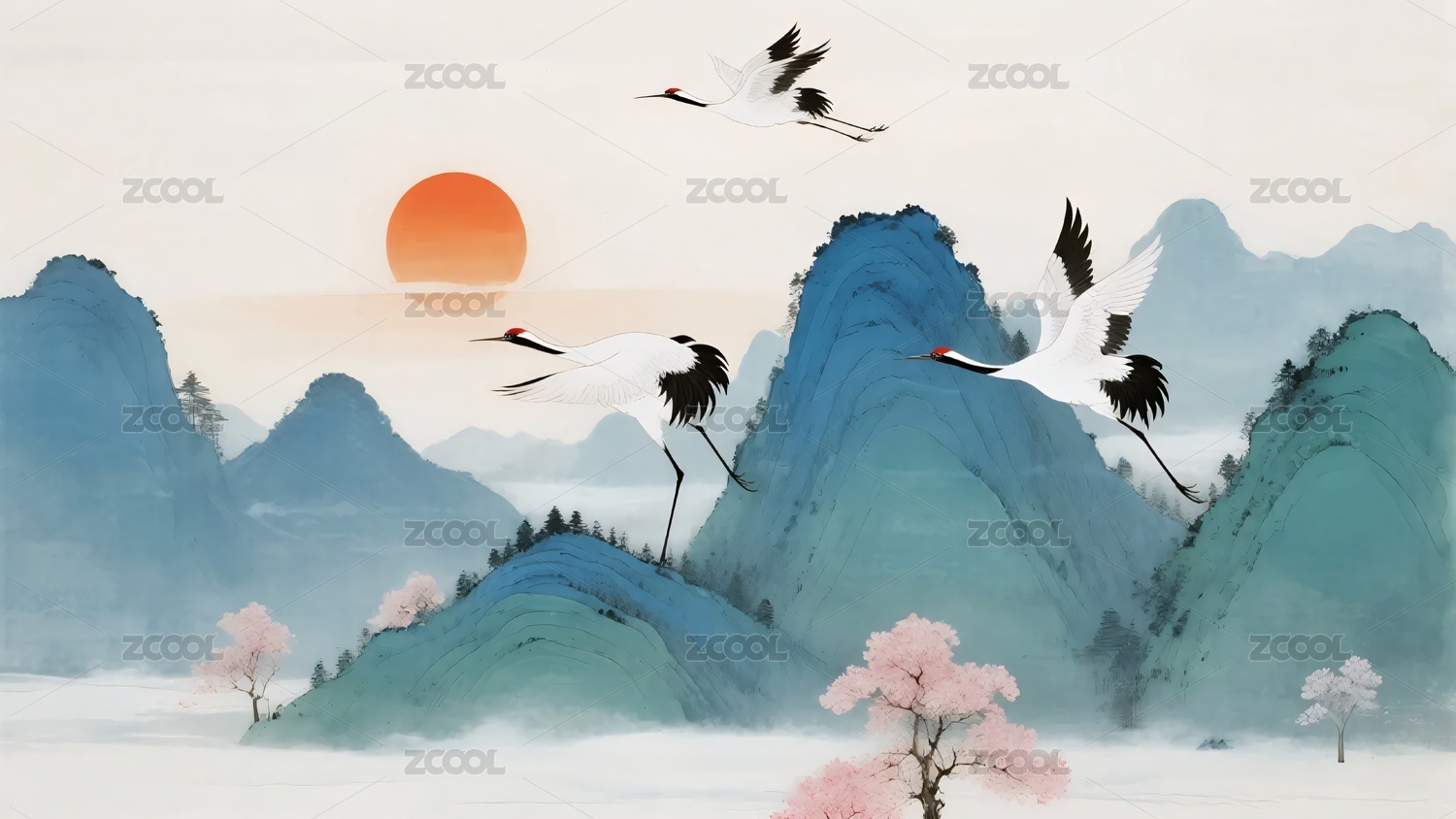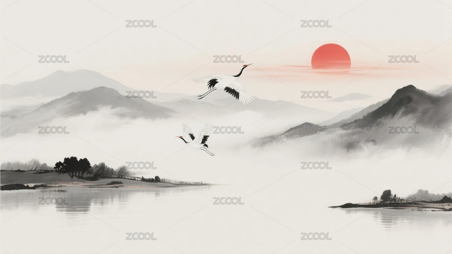 传统,水面,自然,风景,仙鹤,山水,日出,水墨,飞翔,远山