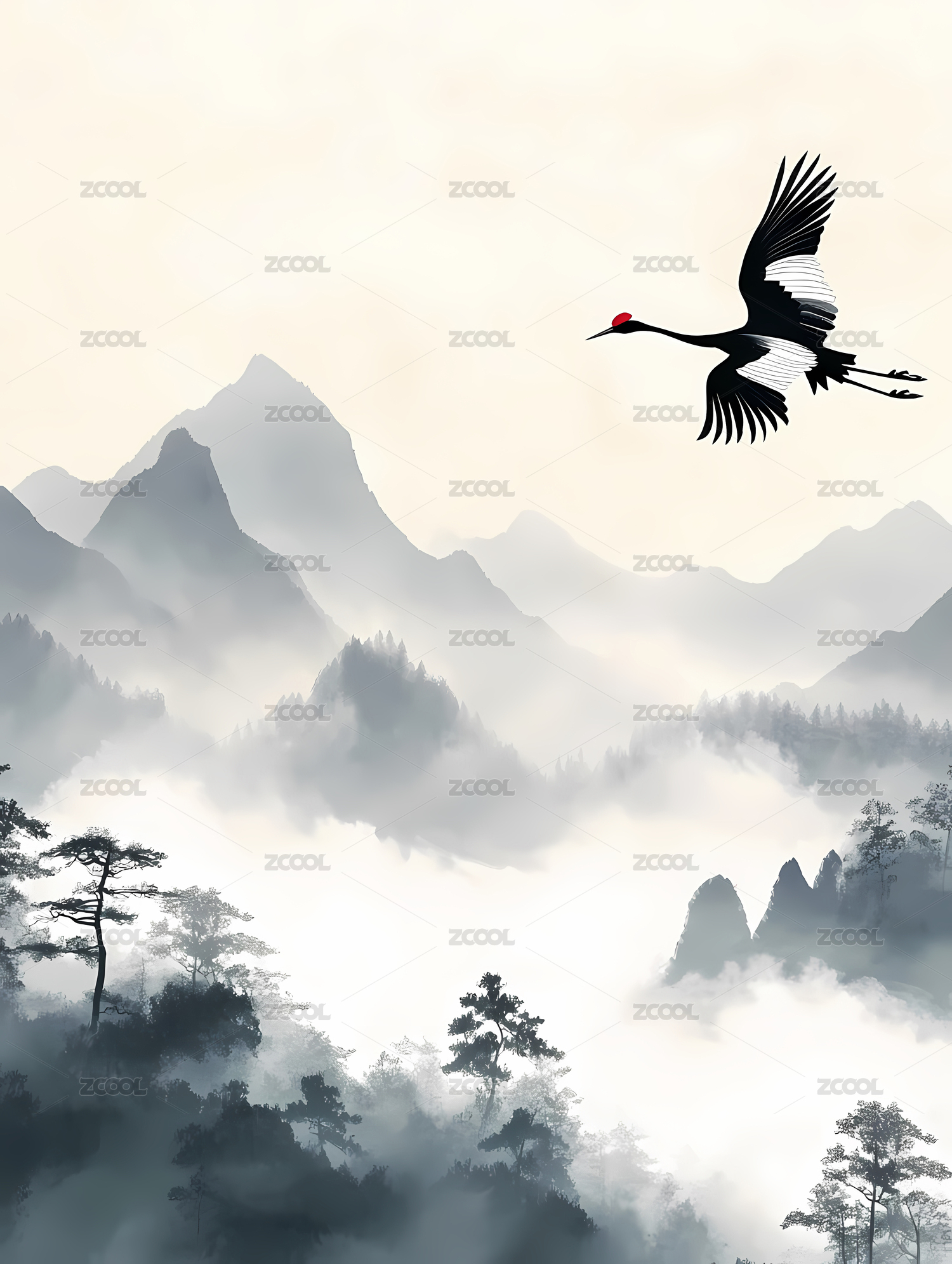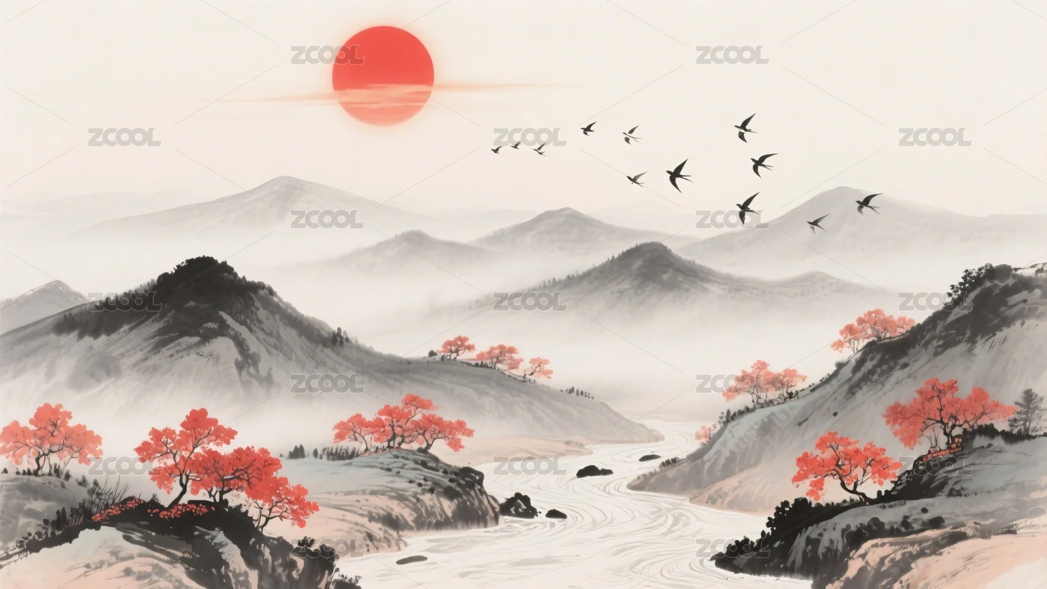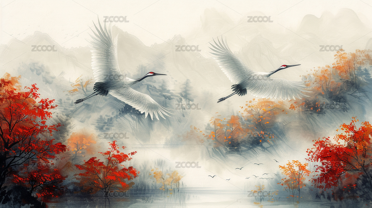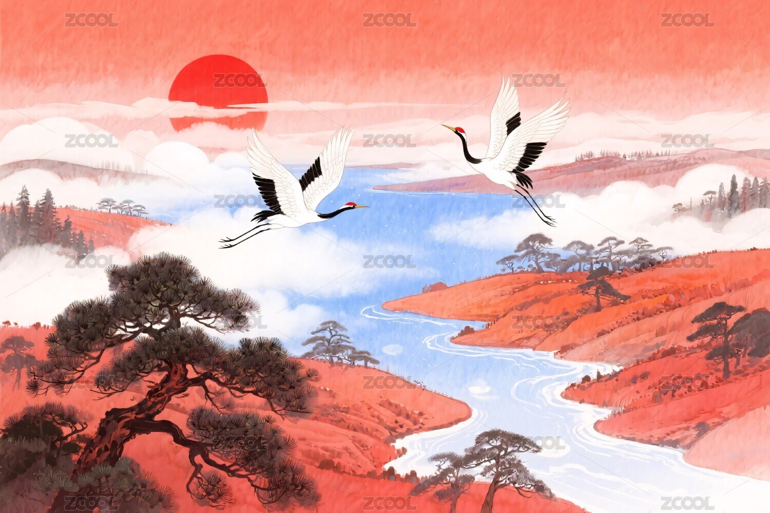 传统,水面,自然,风景,仙鹤,山水,日出,水墨,飞翔,远山