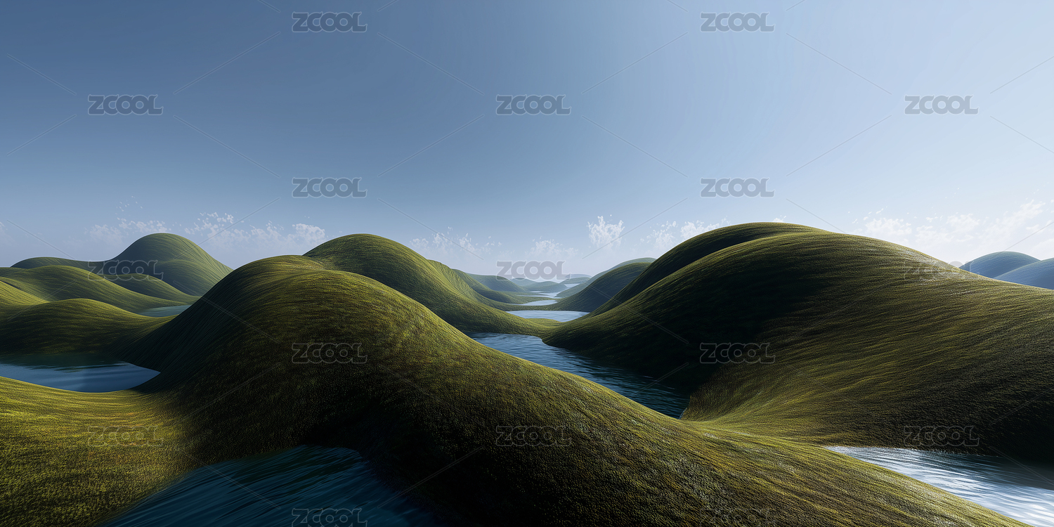 仿真,VR,山丘,绿色,滚动,人工,逼真,细节,渲染,水面
