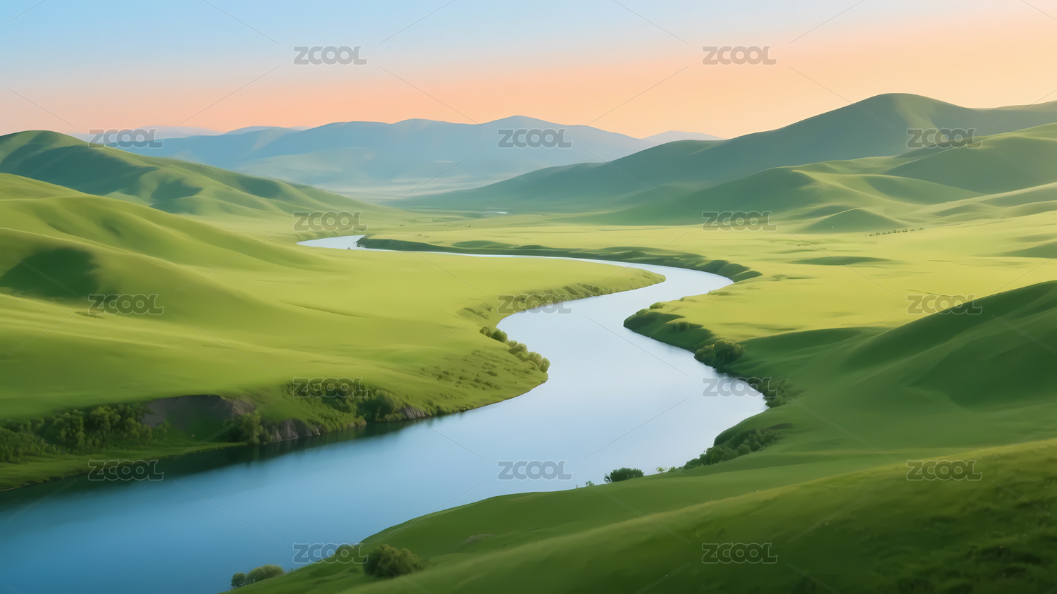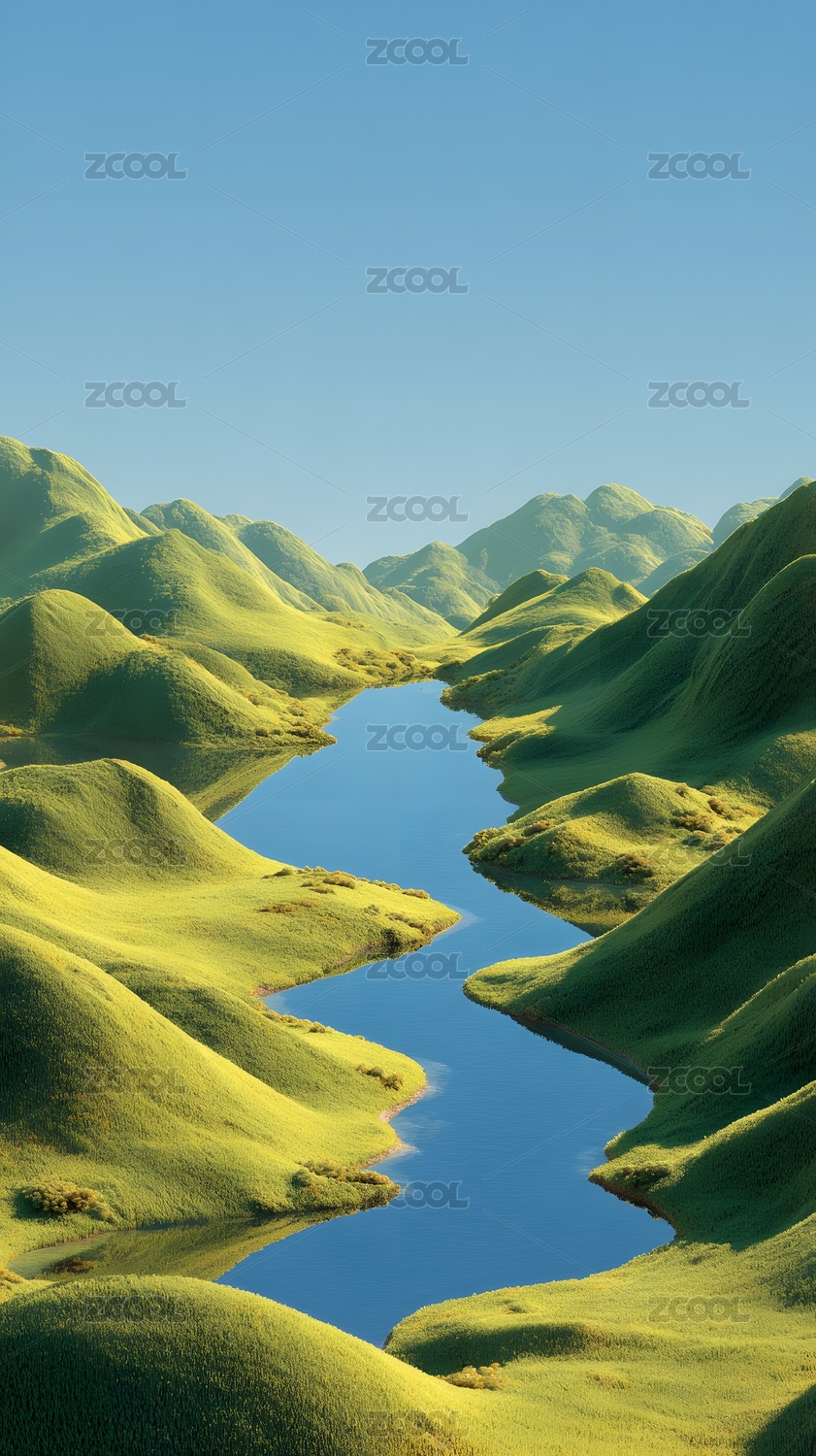 山谷河流风景,蓝天碧水,生机盎然