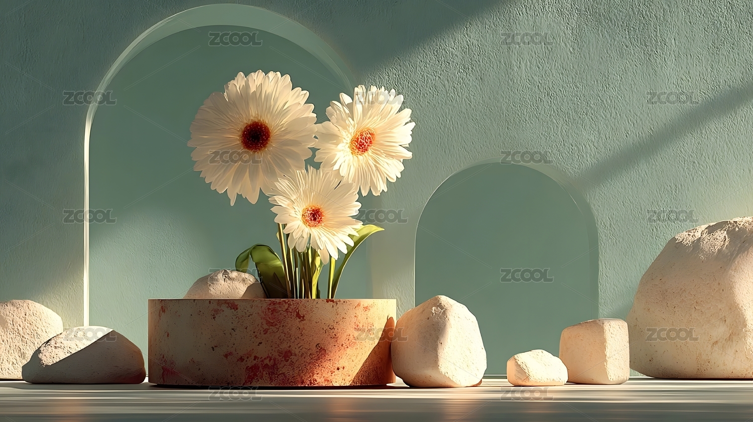 花朵,黄色,球形,枝干,绿色岩石,火山,黑色,簇拥,设置,极简
