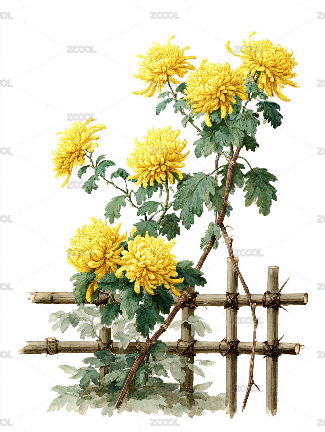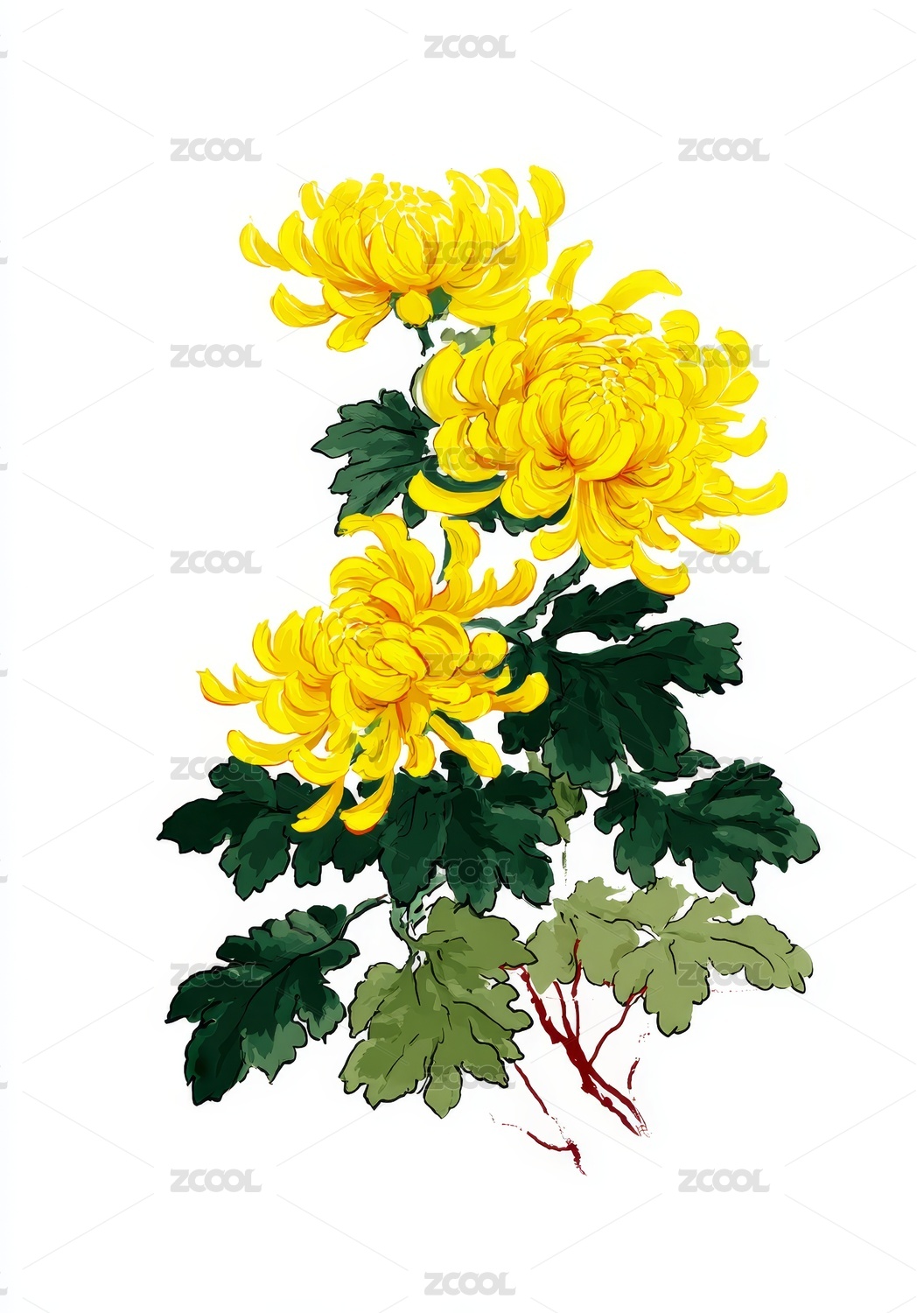 菊花,中国,水墨,绘画,风格,黄色,花朵,绿色,叶子,矢量