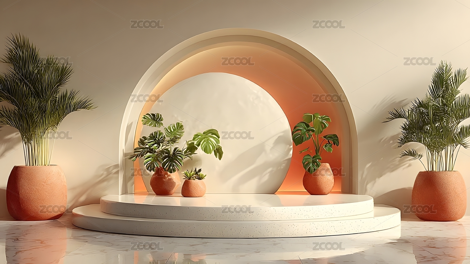 大理石拱门与绿植的室内场景