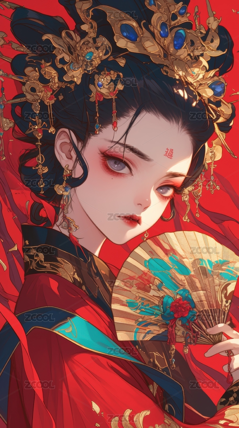 华丽古装女子手持折扇