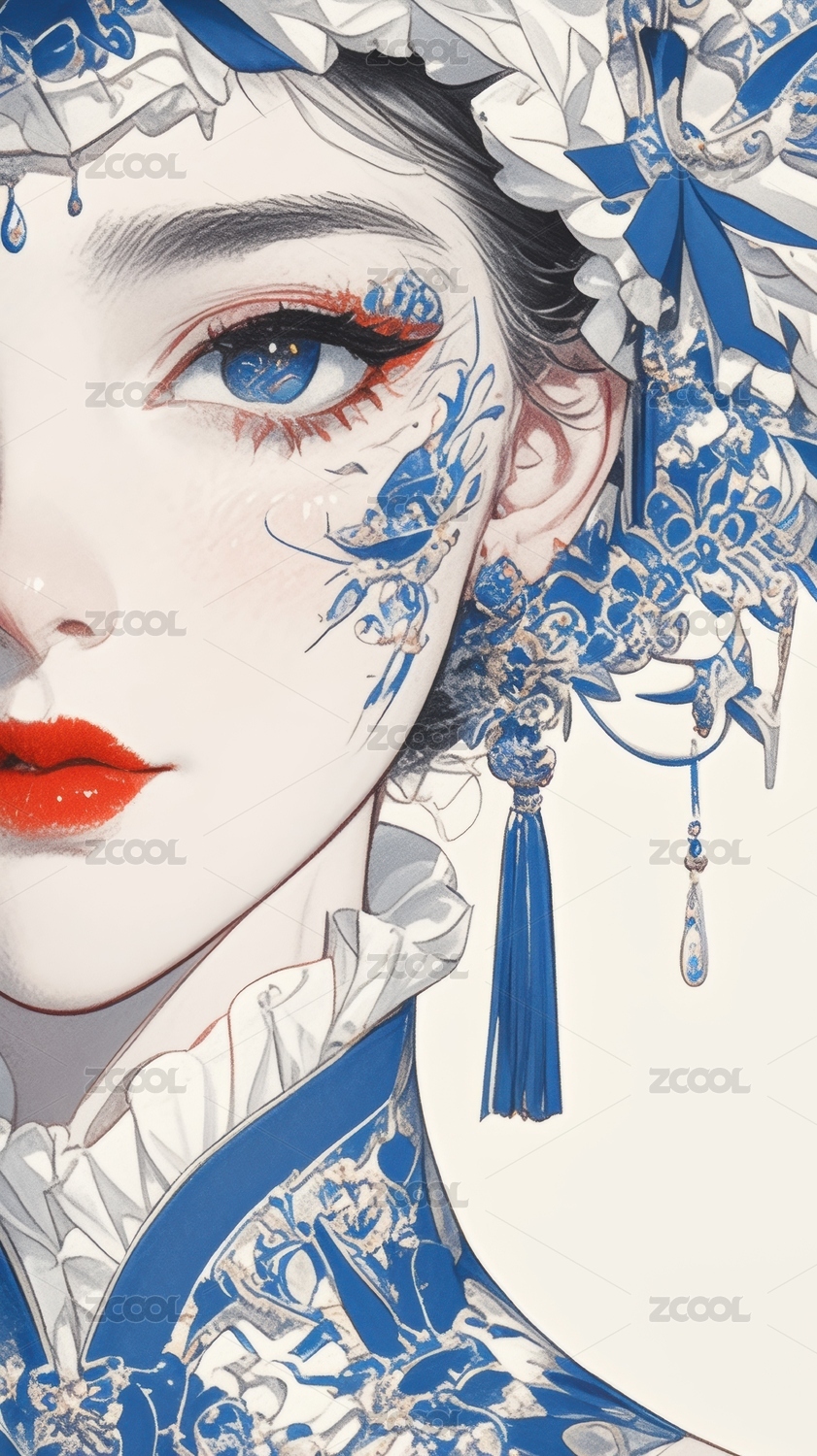 蓝白相间的华丽服饰与精致妆容