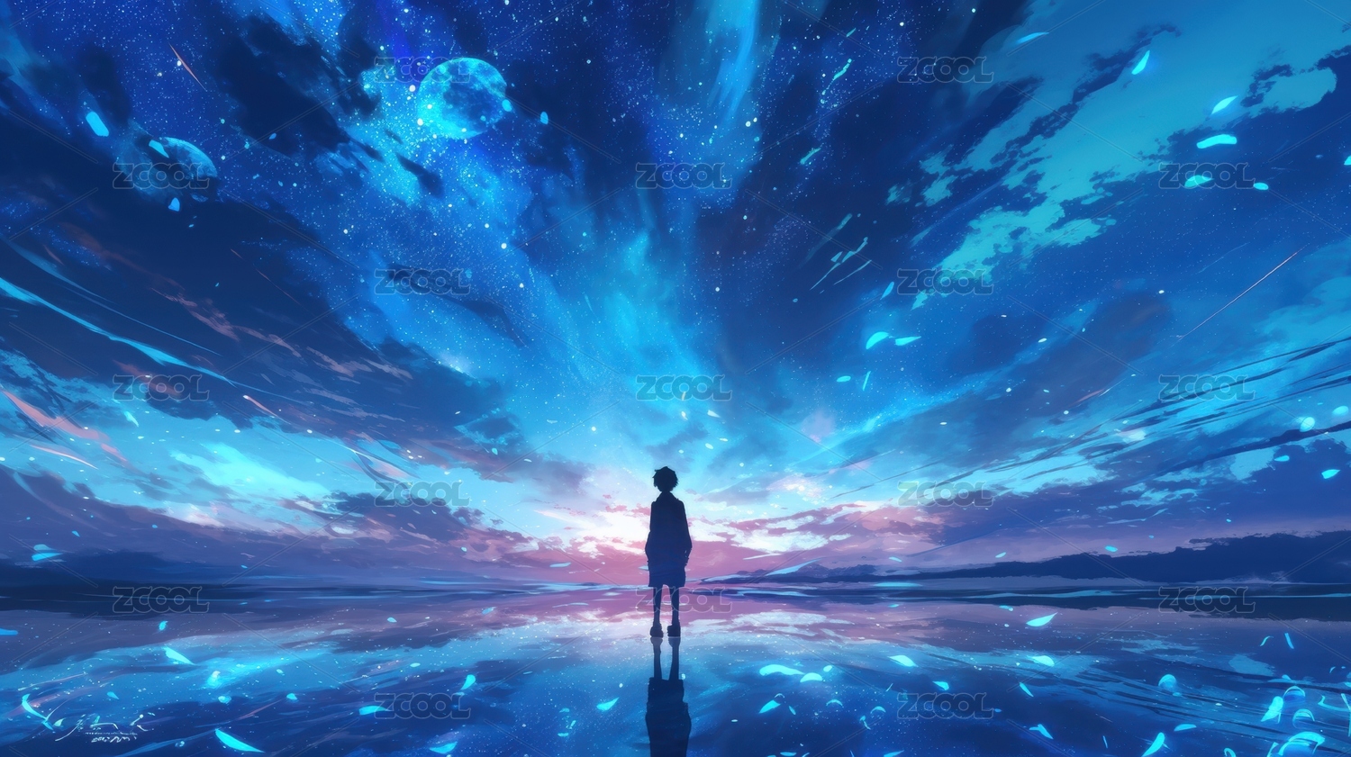 海洋,自然,梦幻,场景,艺术,插画,少女,卡通,粉色,蓝色