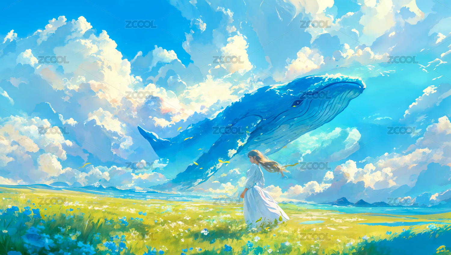 草地上的女孩和天空中的鲸鱼治愈插画