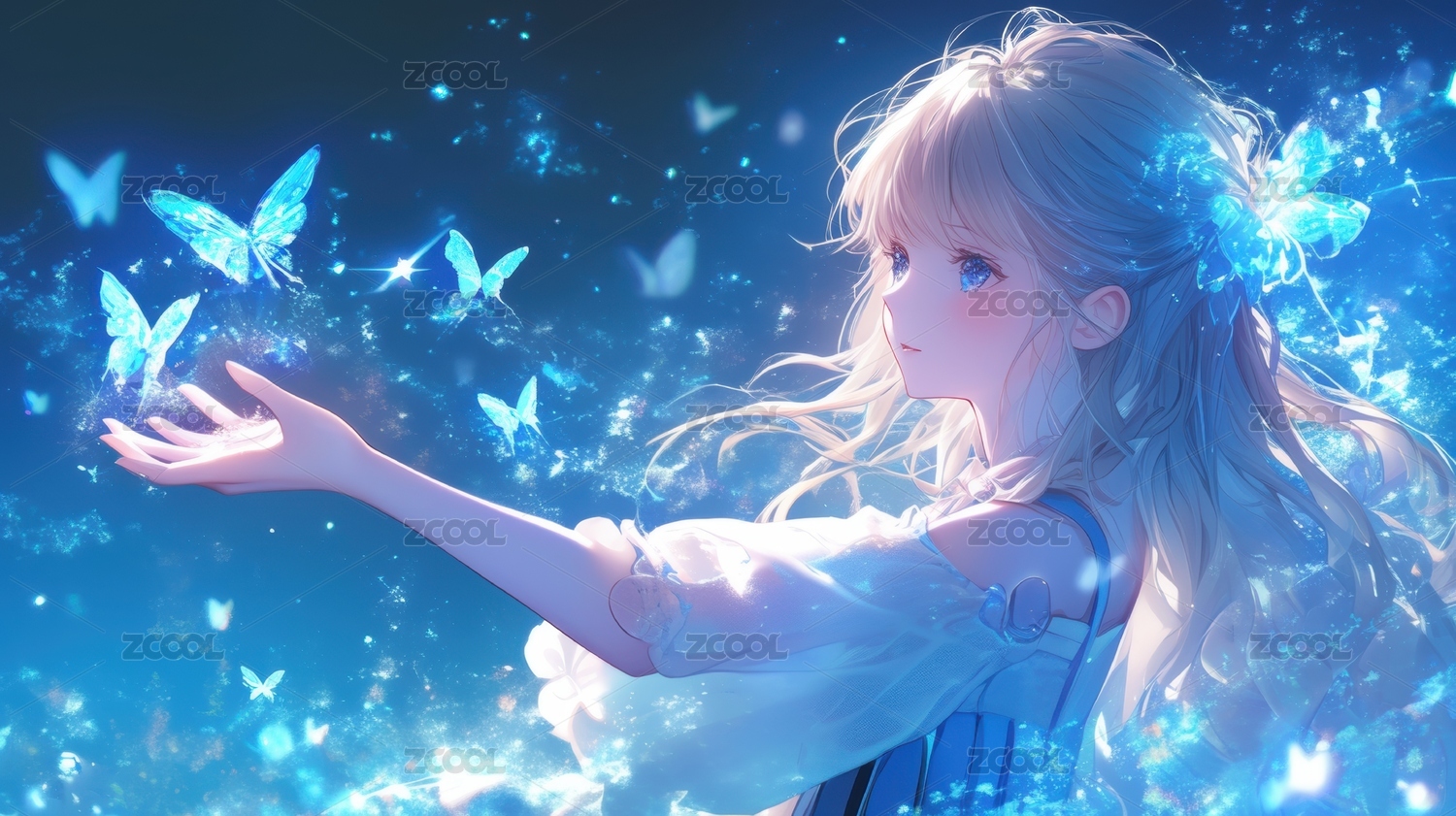 女人蝴蝶翅膀蓝色发光唯美绘画插图