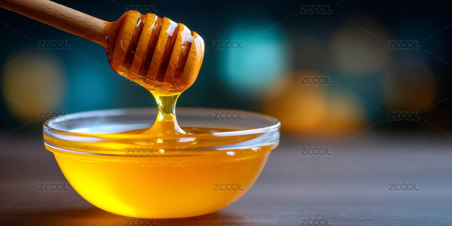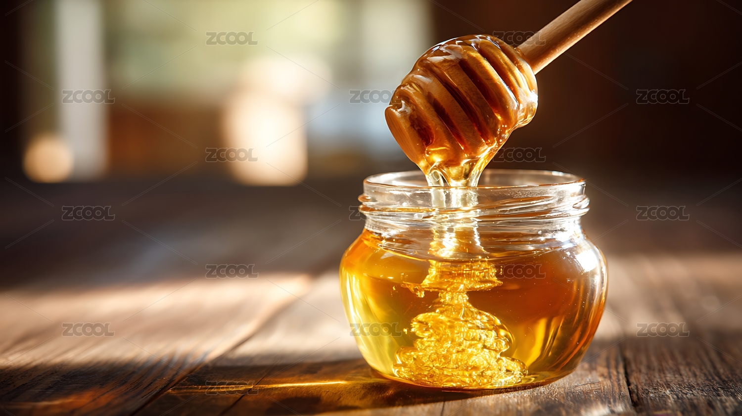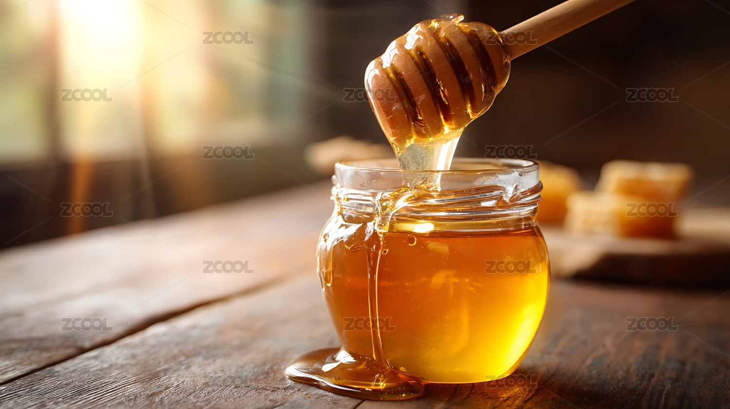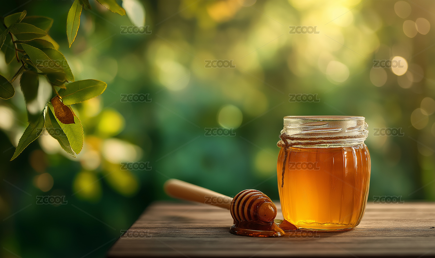 木桌蜂蜜罐与蜜勺的自然美食素材
