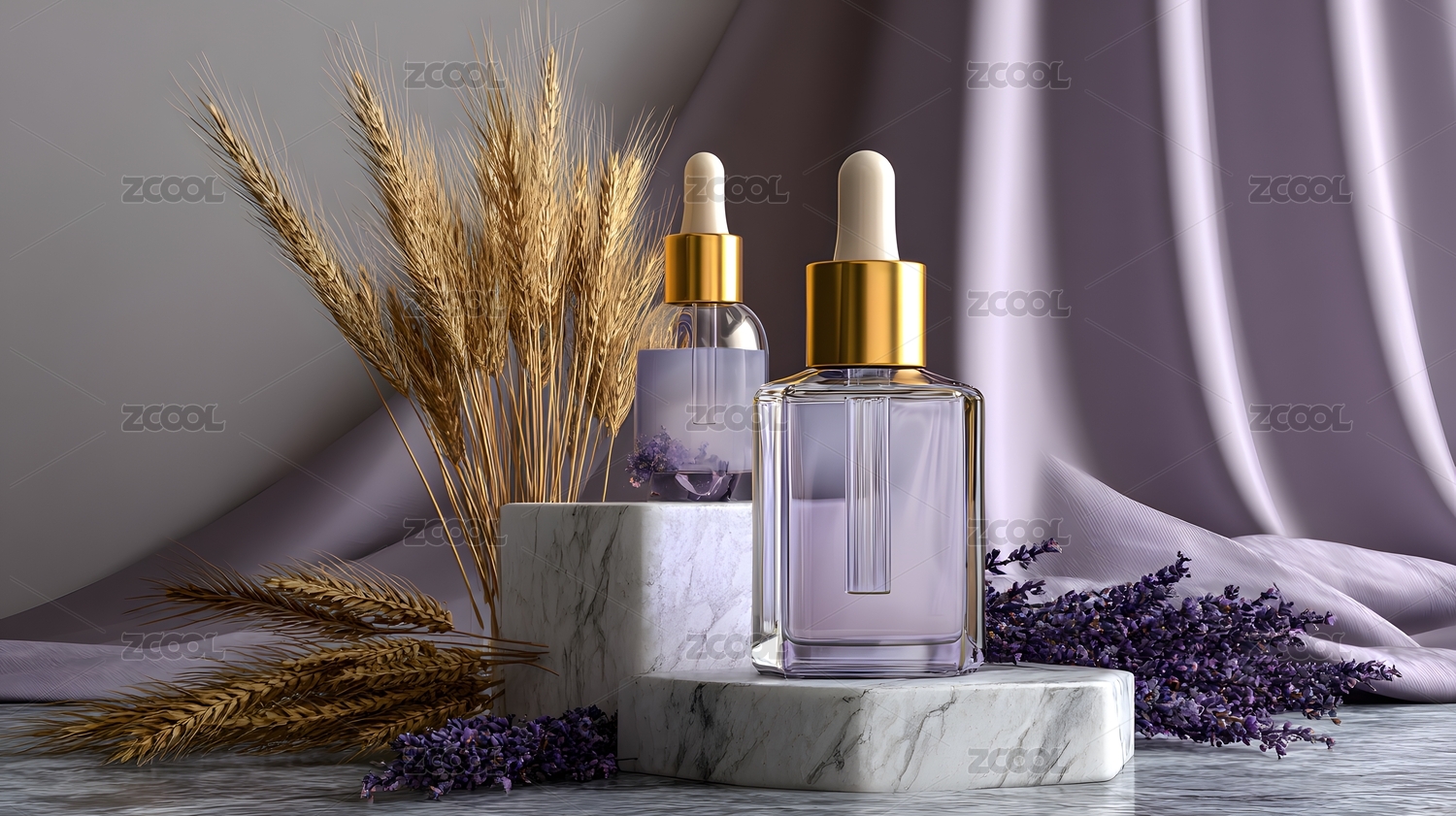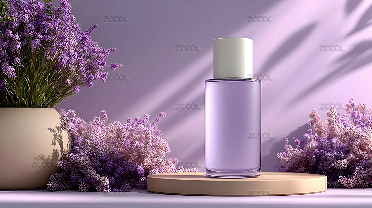 紫色背景下的护肤瓶与薰衣草